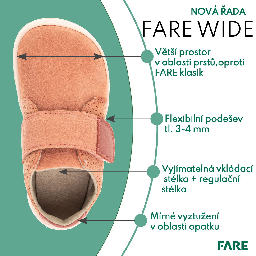 FARE WIDE má od každého tak trochu. Obuv z řady FARE WIDE má vysoce flexibilní podešev, která se ohýbá ve všech směrech. Je pružnější než klasická obuv, ale o něco tužší než FARE BARE. Má mírné vyztužení v oblasti opatku. Na rozdíl od klasické obuvi má nulový drop. V každé botě z řady FARE WIDE najdete vyjímatelnou mírně tvarovanou stélku pro podporu klenby nohy a v krabici je navíc přibalena rovná regulační stélka, kterou můžete snadno vyměnit a doregulovat vnitřní prostor dle potřeby. U kolekce domácí a přezůvkové obuvi FARE WIDE je stélka s klenkovou podporou. Podešev má tloušťku 3-4 mm podle velikosti boty. Doufáme, že vám naše nová řada WIDE poskytne dokonalou kombinaci komfortu a podpory.