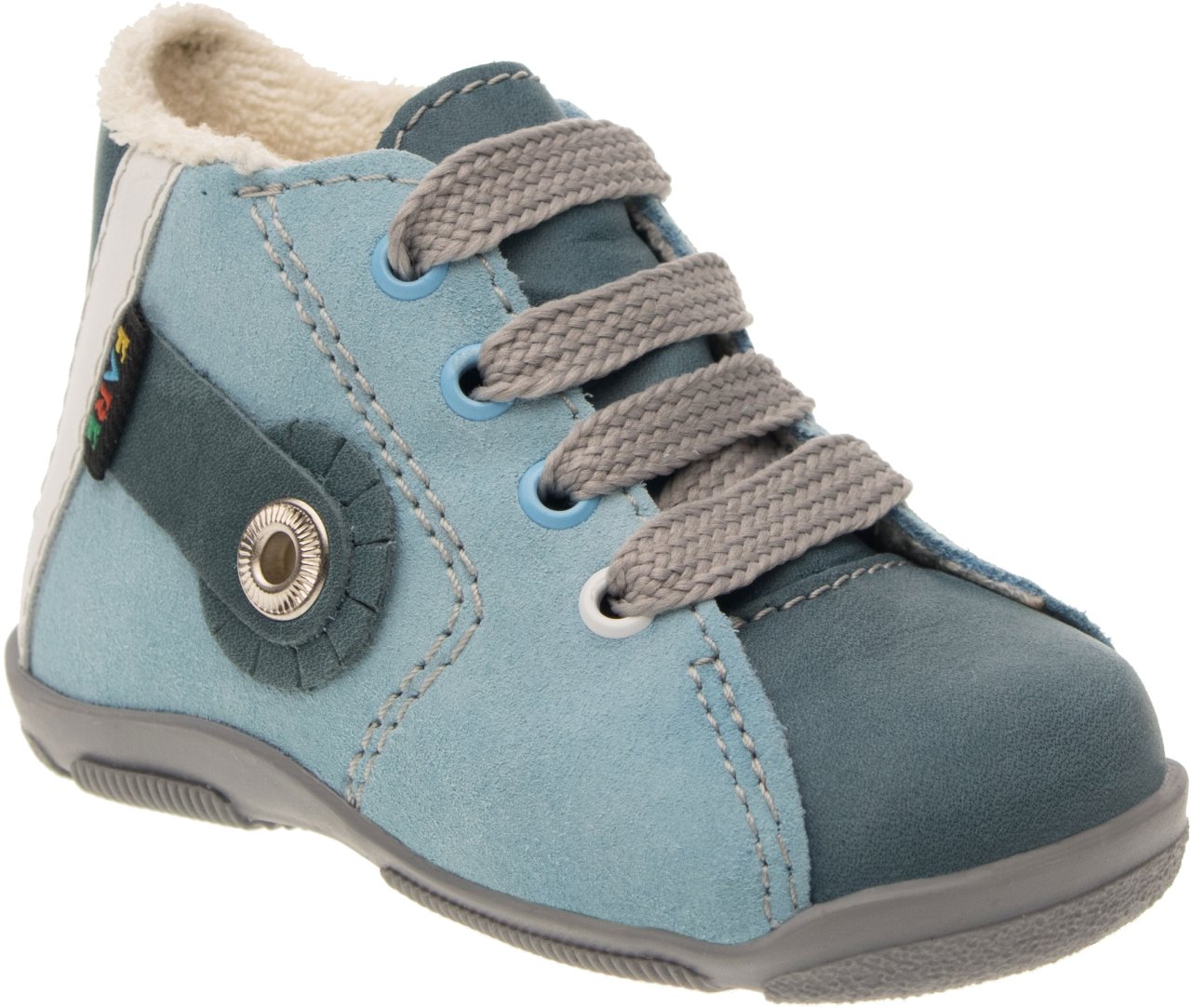 Lehká, kotníčková obuv, šněrovací, maximálně ohebná, určená pro první dětské krůčky, kdy si dítě začíná zvykat na pevnou obuv.Vrchový materiál - pravá kůže broušená - nubuk - v kombinaci s kůží hladkou. Podšívka - bavlněné froté. Předností je vyjímatelná vkládací stélka a pevný opatek. Podešev je z termoplastického kaučuku, lehká, ohebná, ve špici a v patě vyvýšená.