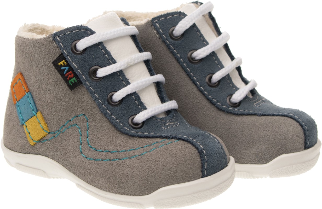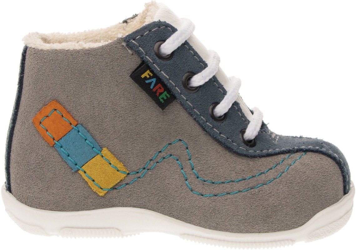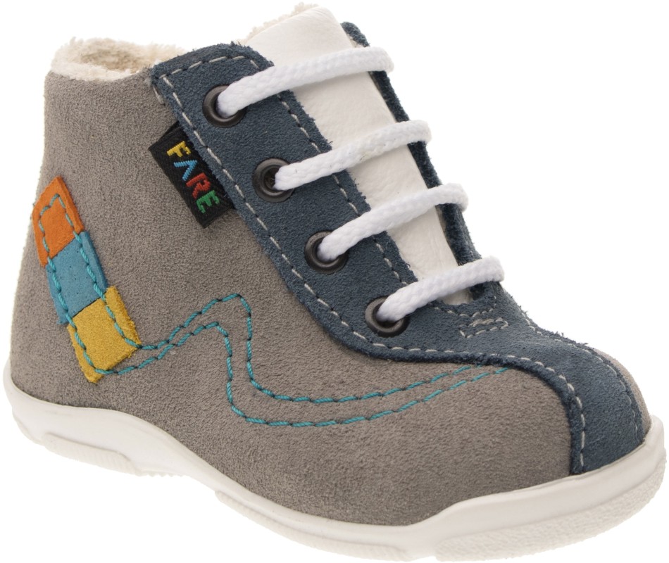 Lehká, kotníčková obuv, šněrovací, maximálně ohebná, určená pro první dětské krůčky, kdy si dítě začíná zvykat na pevnou obuv.Vrchový materiál - pravá kůže, broušená. Podšívka - bavlněné froté. Předností je vyjímatelná vkládací stélka a pevný opatek. Podešev je z termoplastického kaučuku, lehká, ohebná, ve špici a v patě vyvýšená.