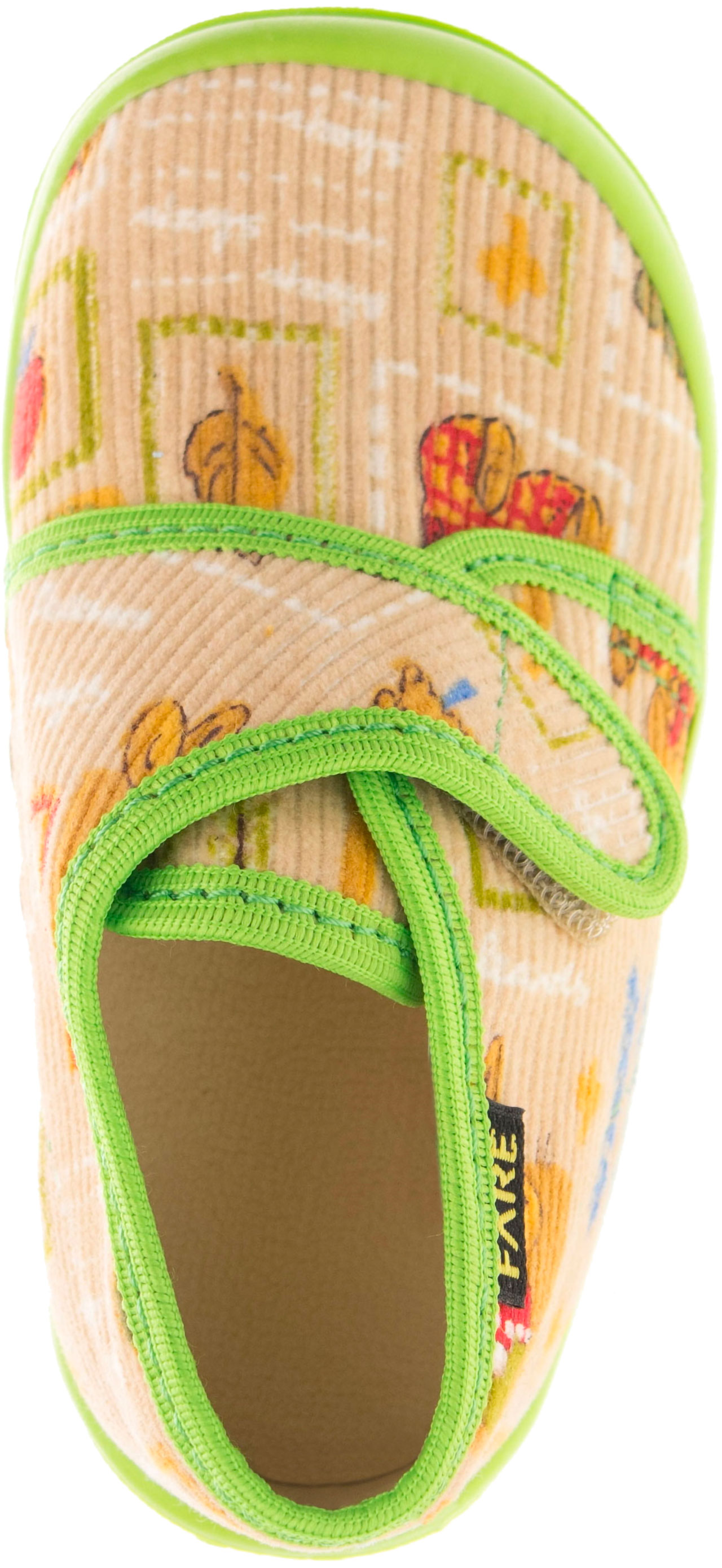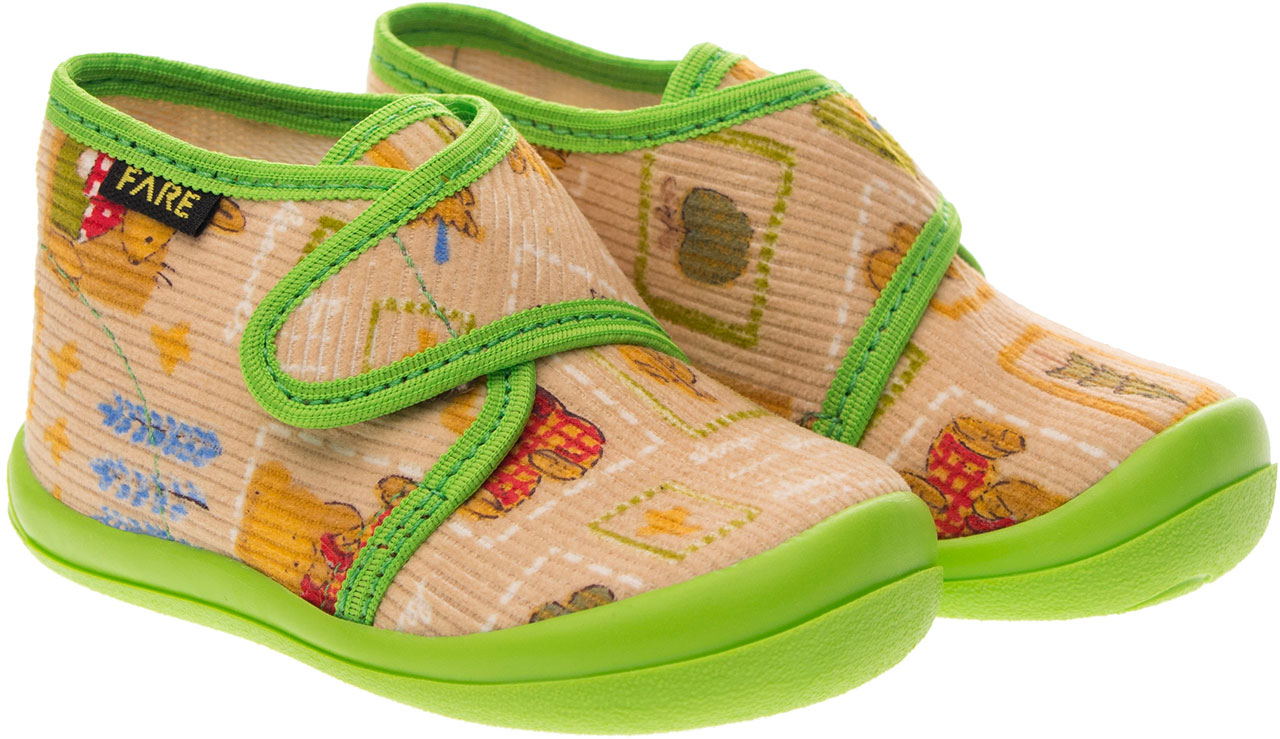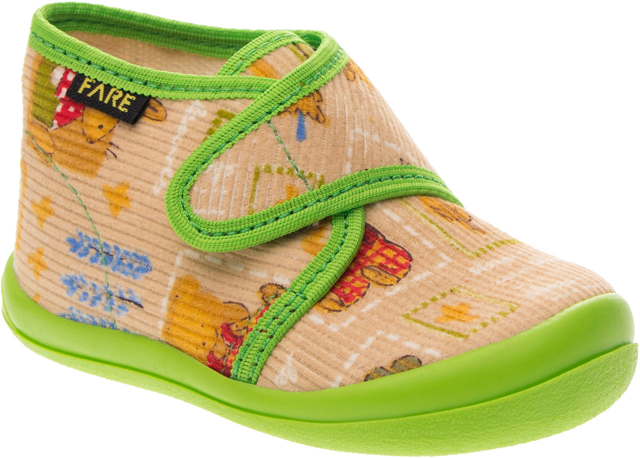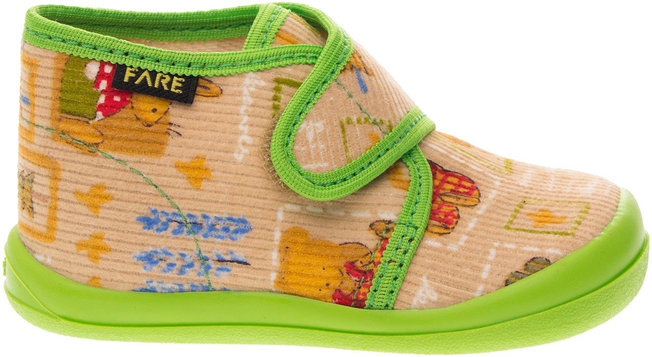 Přezůvková, kotníčková, textilní, lemovaná obuv, na velcro. Materiál svršku je z barevného pracího kordu, vnitřek je z bavlněného kepru. Podešev je vyvinuta jako odlehčená, materiál podešve z termoplastického elastomeru, je neklouzavá pro všechny běžně používané podlahoviny. Tato domácí a přezůvková obuv odpovídá ortopedickým požadavkům a zásadám zdravého obouvání. Obuv je v prstové části prostorově vytvarována, je vybavena pevným opatkem tak, jako je běžné u kvalitní celokožené obuvi. Vkládací stélka je vybavena komfortní tlumící vrstvou. Obuv je designována v souladu nejmodernějšími módními trendy, včetně podešve, která chrání přední část před rychlým opotřebením.