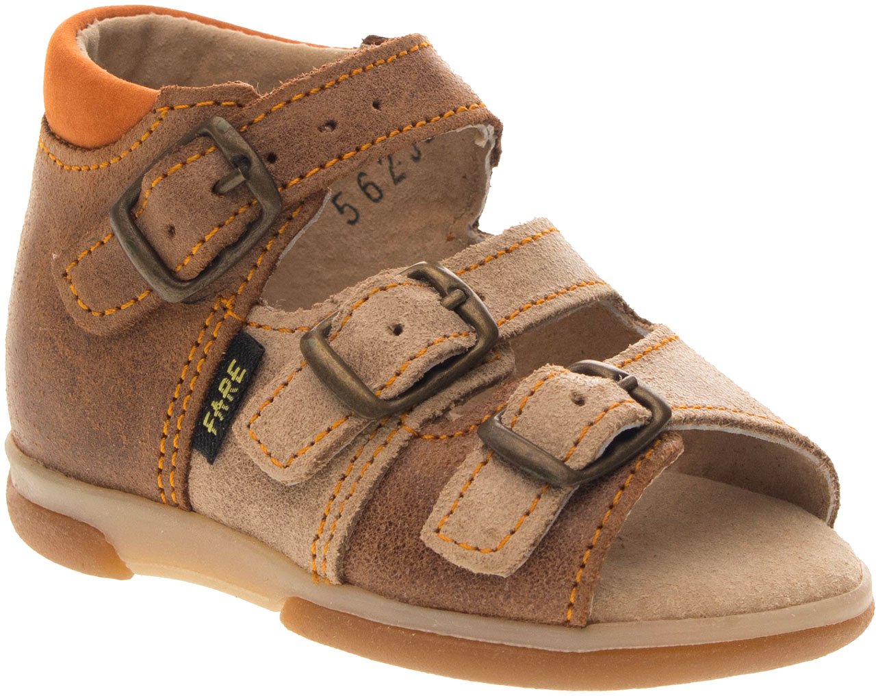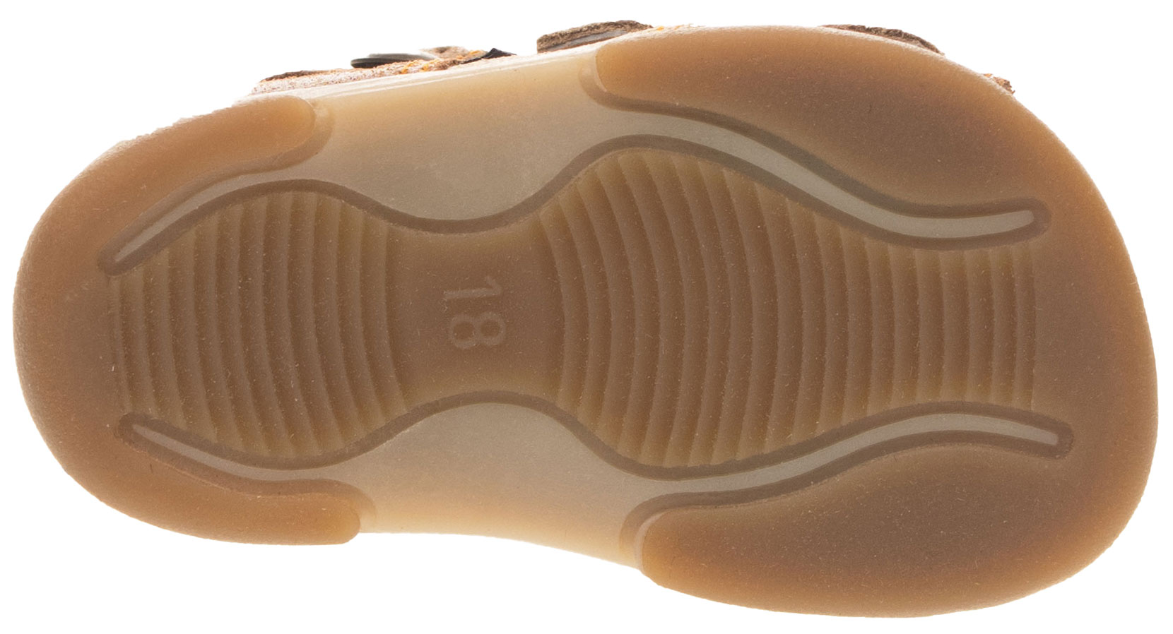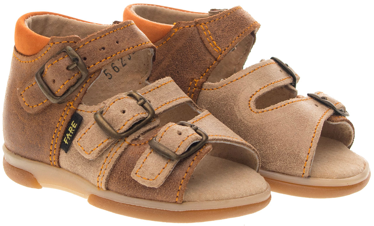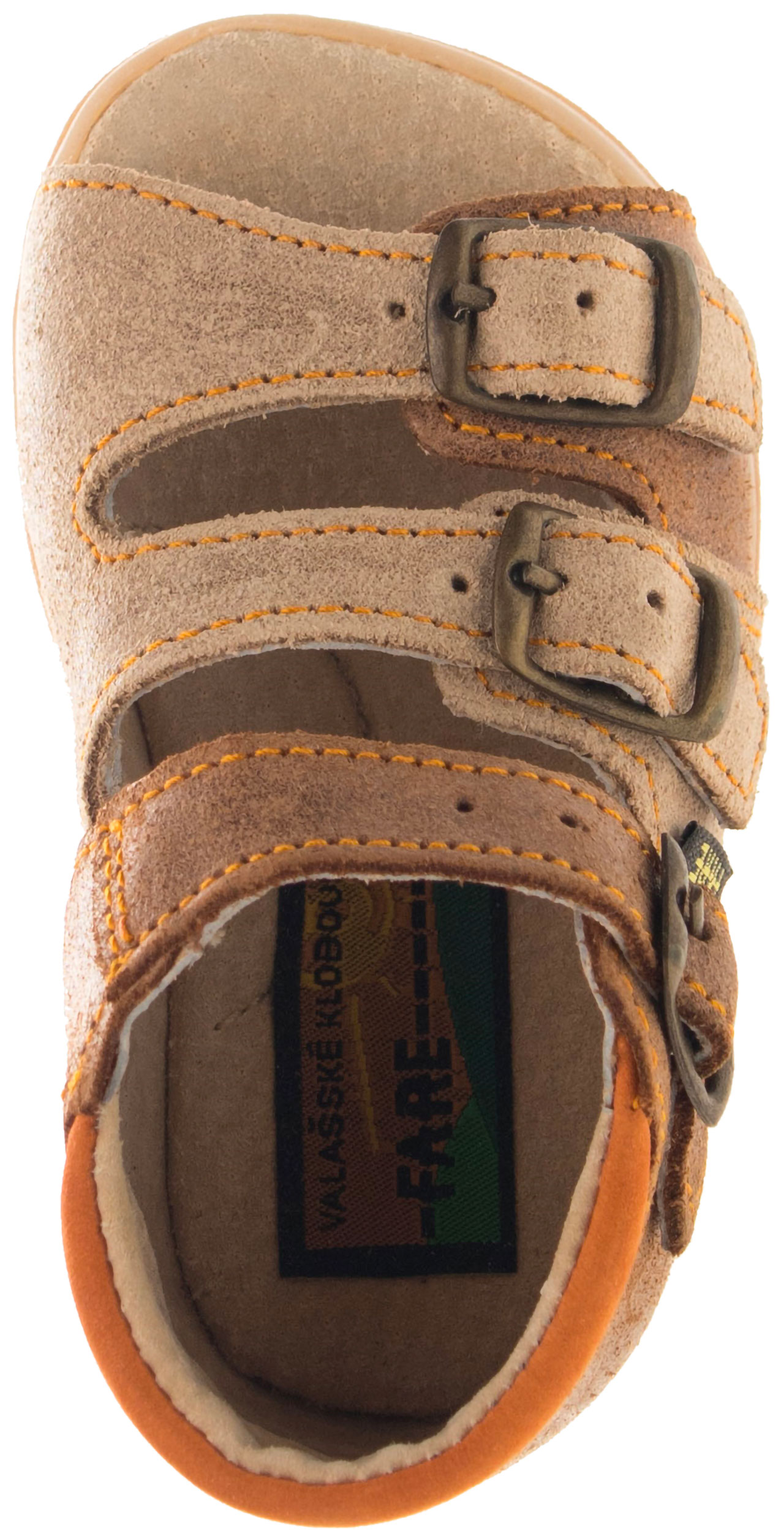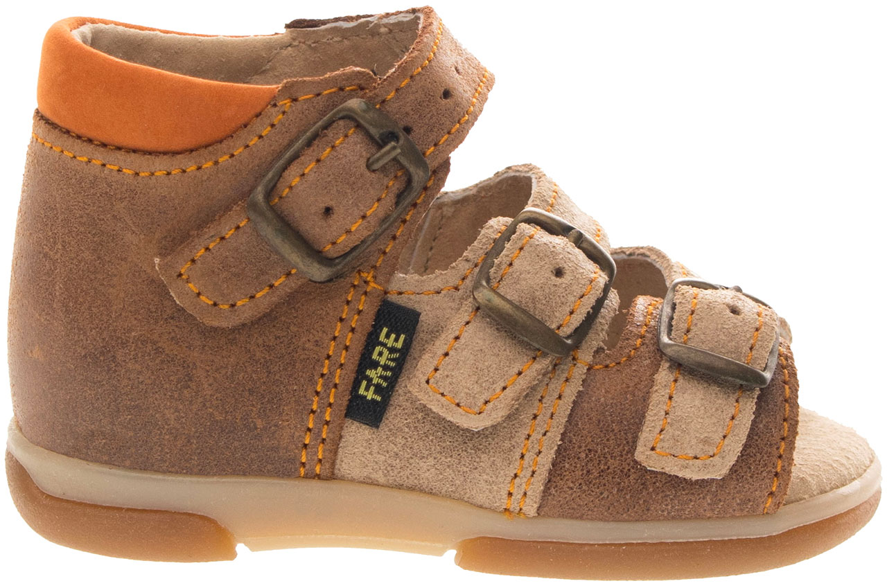 Sandálková obuv bez špice, zapínání na přezky. Vrchový materiál - pravá broušená kůže se speciální voskovou úpravou. Podšívka - pravá kůže. Podešev je z termoplastického kaučuku. Předností je vypolstrovaná fuzbeta, regulovatelnost obuvi přes nárt, pevný opatek a výška paty - v tomto věku dítěte velmi důležitá.