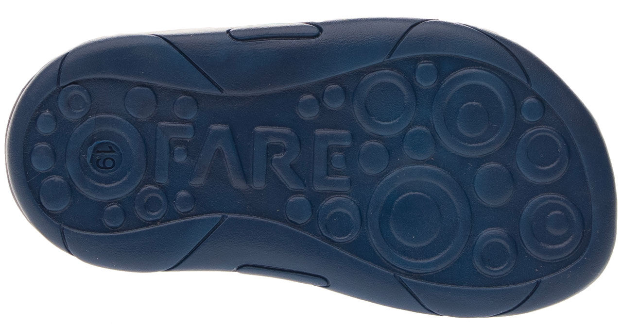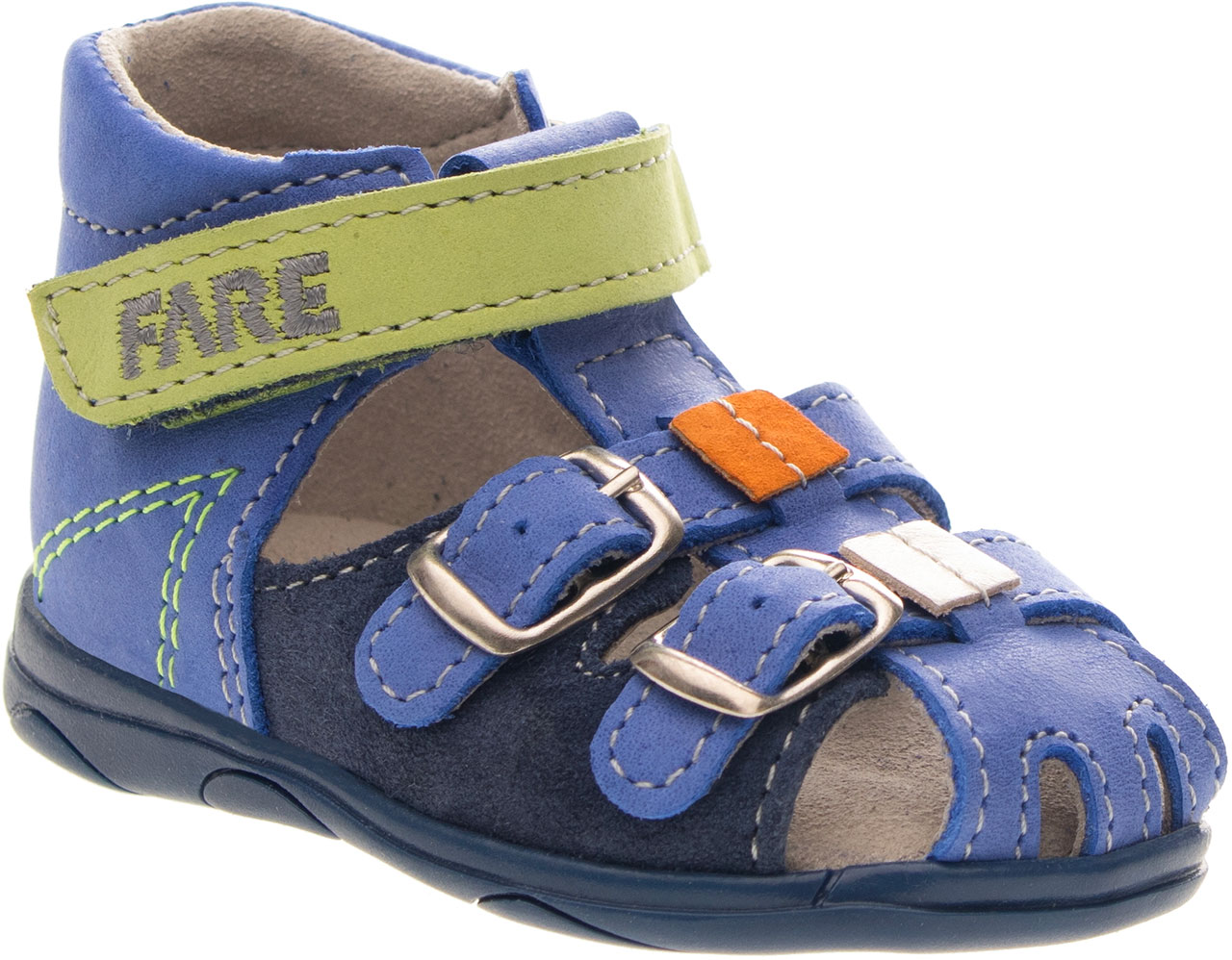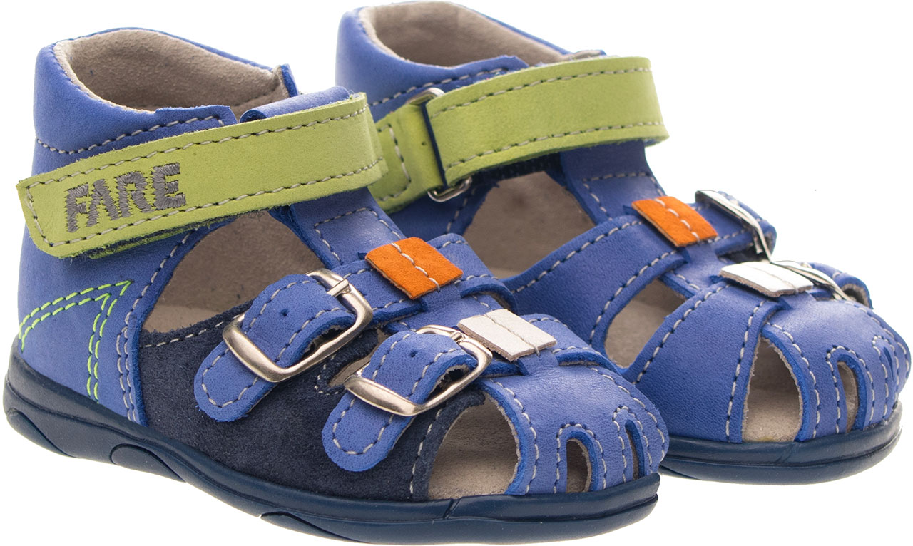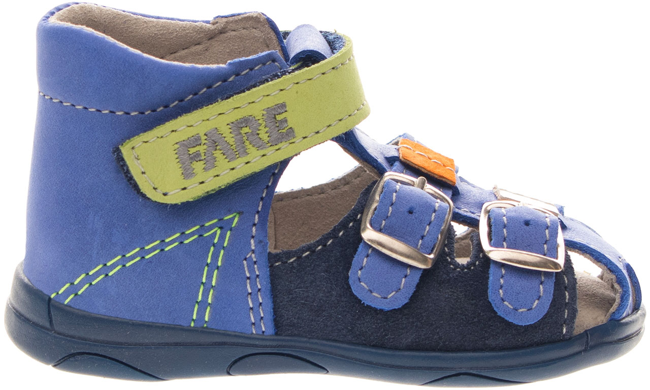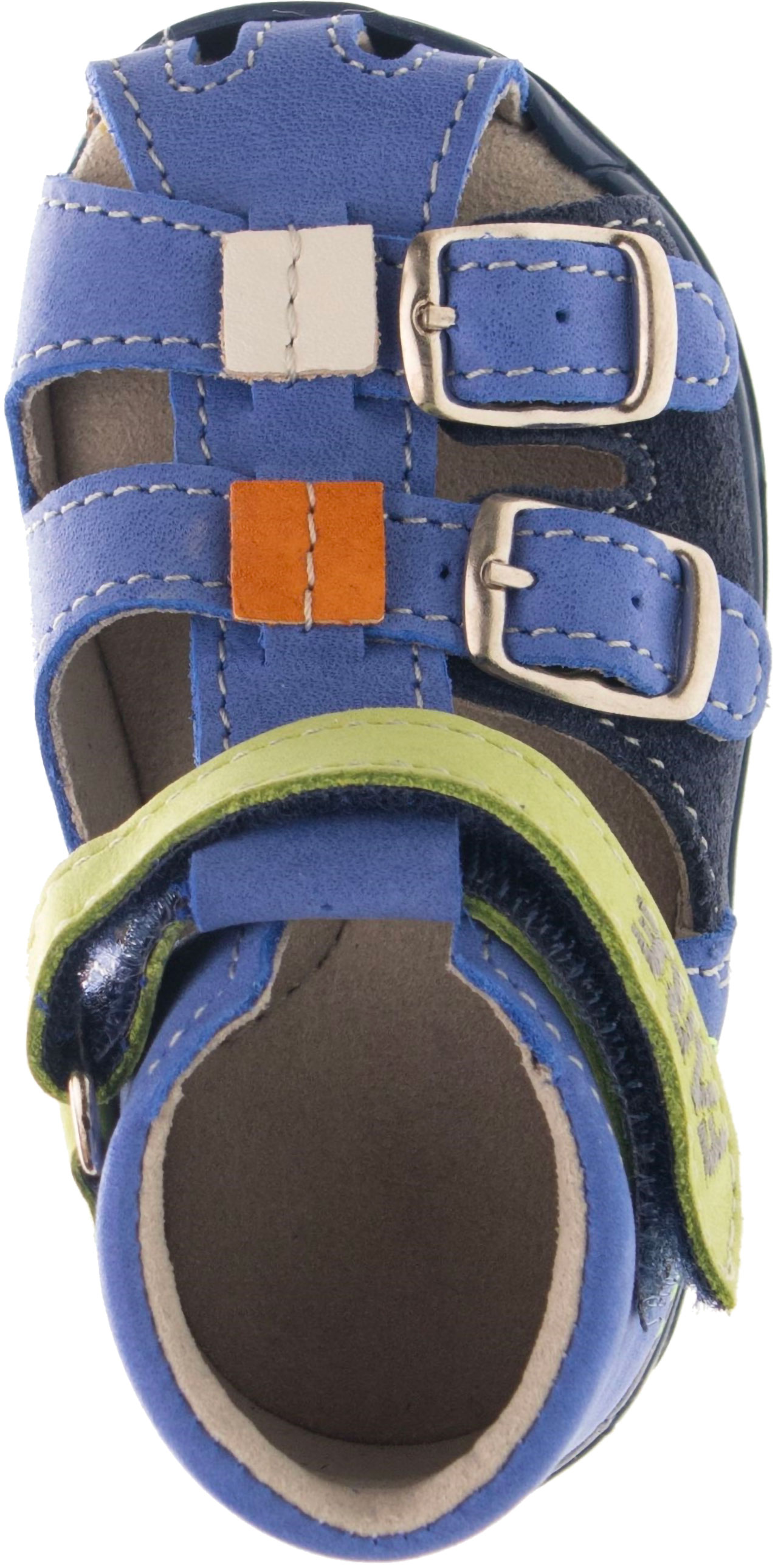 Sandálková obuv, zapínání na suchý zip. Vrchový materiál - pravá kůže hladká. Podšívka - netkaná textilie. Podešev je z termoplastického kaučuku. Předností je vypolstrovaná stélka, částečně uzavřená špice, regulovatelnost obuvi přes nárt, pevný opatek a výška paty - v tomto věku dítěte velmi důležitá.
