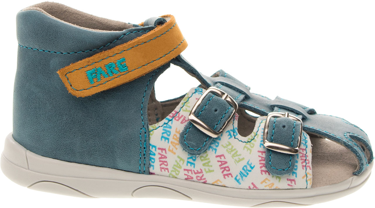 Sandálková obuv, zapínání na přezky. Vrchový materiál - pravá kůže hladká. Podšívka - pravá kůže. Podešev je z termoplastického kaučuku. Předností je vypolstrovaná stélka, částečně uzavřená špice, regulovatelnost obuvi přes nárt, pevný opatek a výška paty - v tomto věku dítěte velmi důležitá.