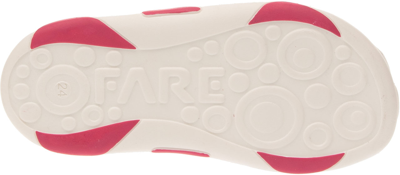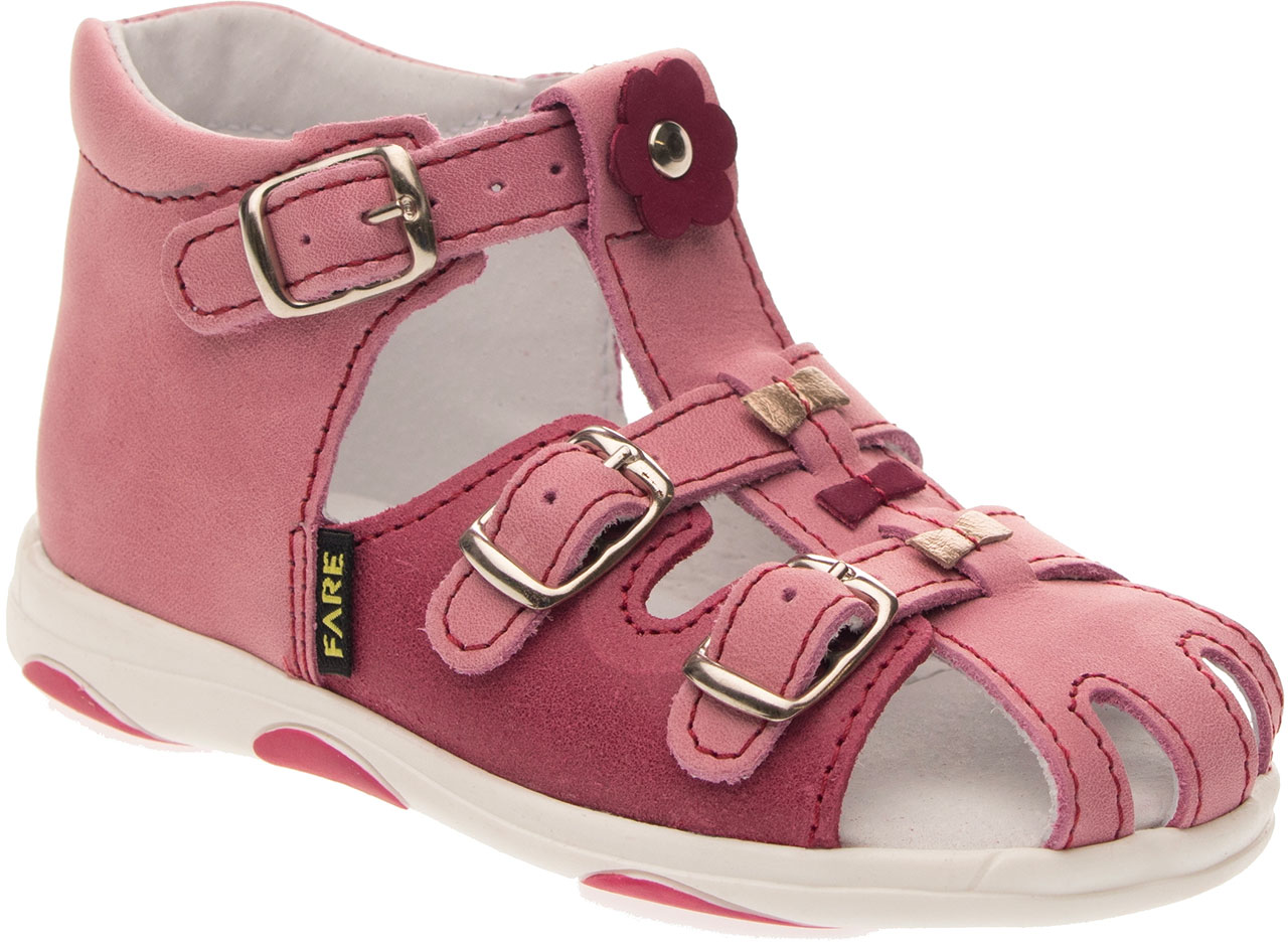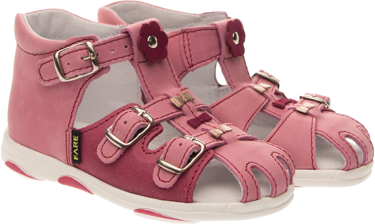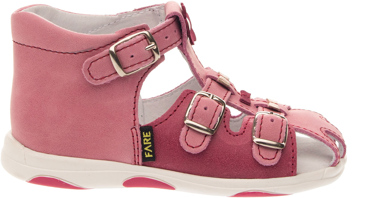 Sandálková obuv, zapínání na přezky. Vrchový materiál - pravá kůže hladká. Podšívka - pravá kůže. Podešev je z termoplastického kaučuku. Předností je vypolstrovaná stélka, částečně uzavřená špice, regulovatelnost obuvi přes nárt, pevný opatek a výška paty - v tomto věku dítěte velmi důležitá.