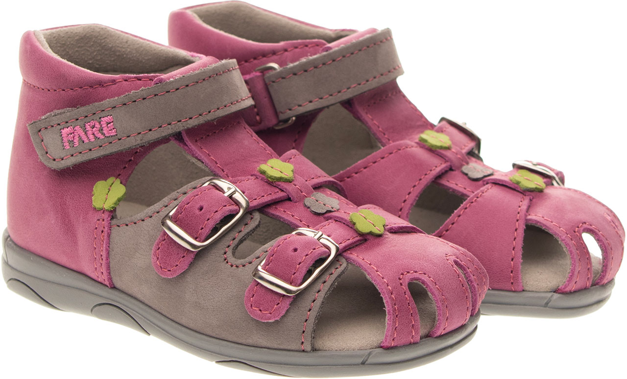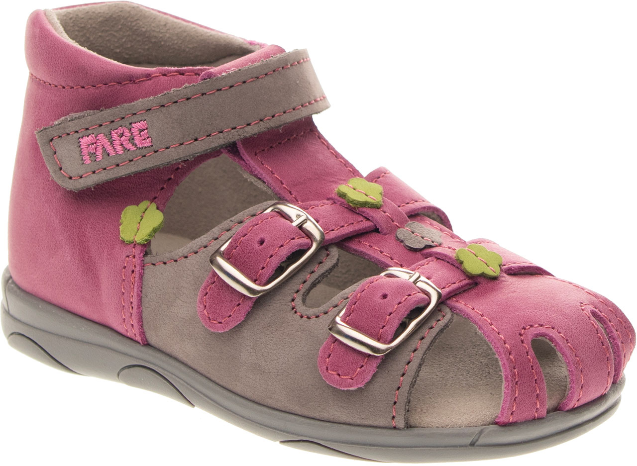 Sandálková obuv, zapínání na přezku. Vrchový materiál - pravá kůže hladká. Podšívka - netkaná textilie. Podešev je z termoplastického kaučuku. Předností je vypolstrovaná stélka, částečně uzavřená špice, regulovatelnost obuvi přes nárt, pevný opatek a výška paty - v tomto věku dítěte velmi důležitá.