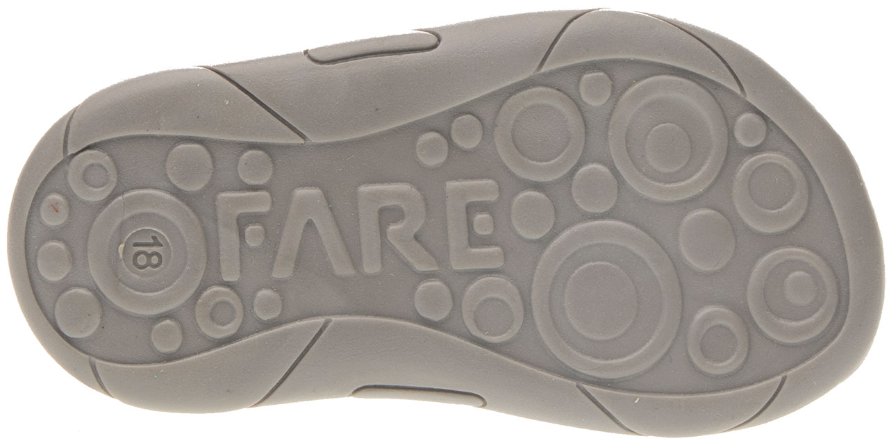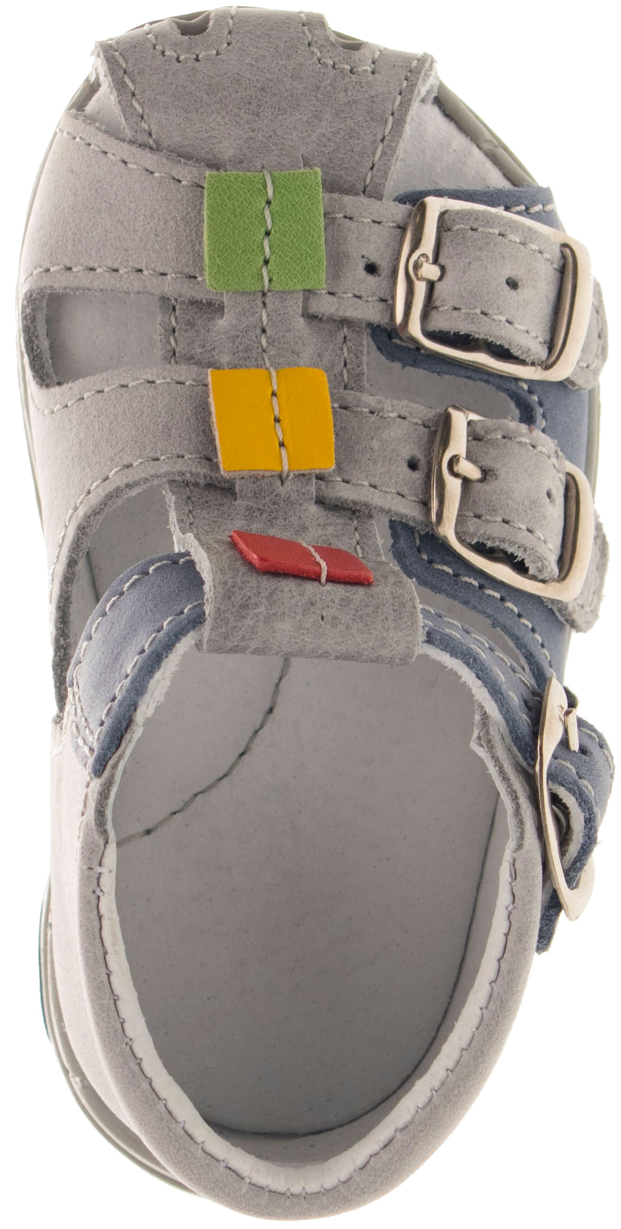 Sandálková obuv, zapínání na přezky. Vrchový materiál - pravá kůže hladká. Podšívka - pravá kůže. Podešev je z termoplastického kaučuku. Předností je vypolstrovaná fuzbeta, částečně uzavřená špice, regulovatelnost obuvi přes nárt, pevný opatek a výška paty - v tomto věku dítěte velmi důležitá.