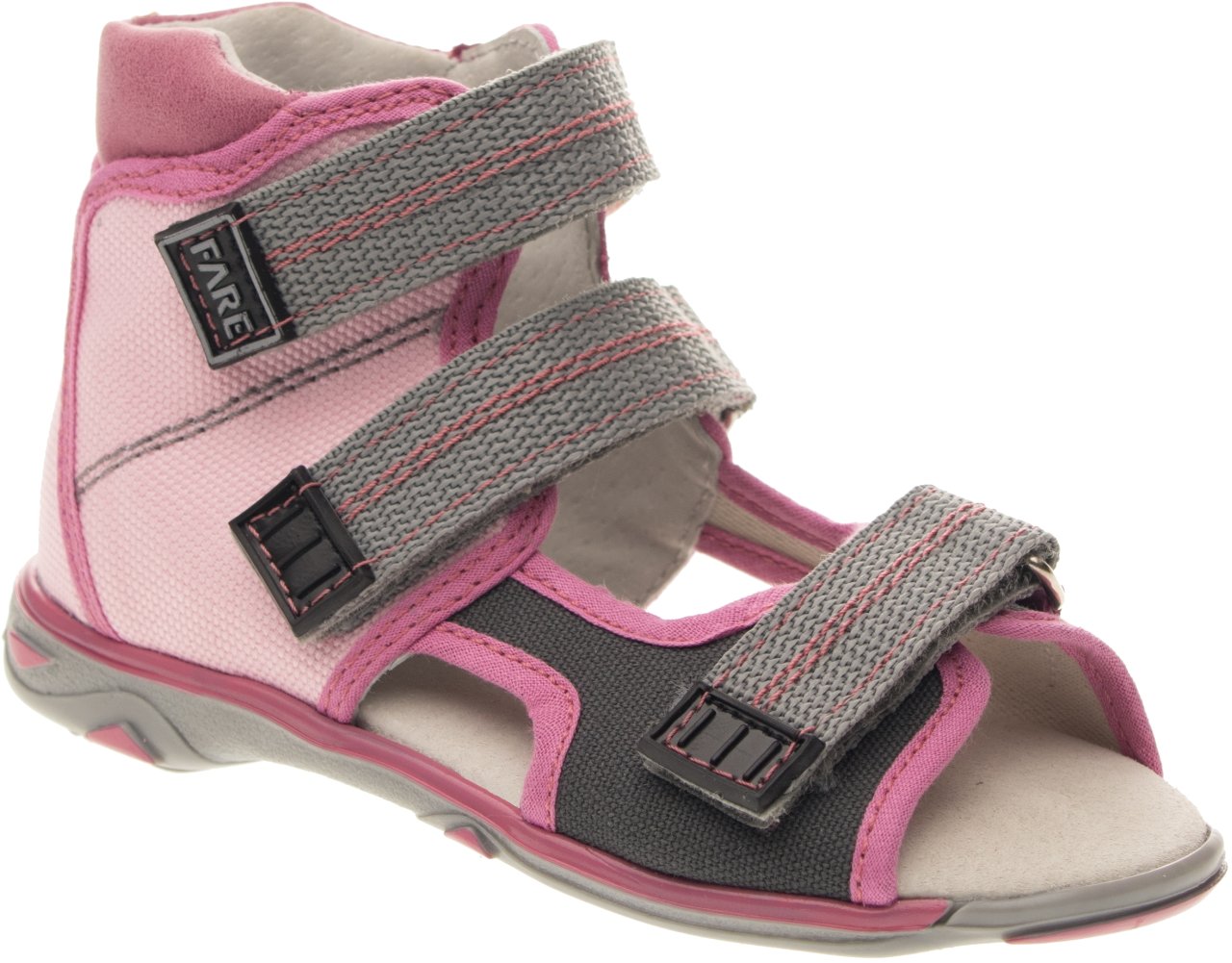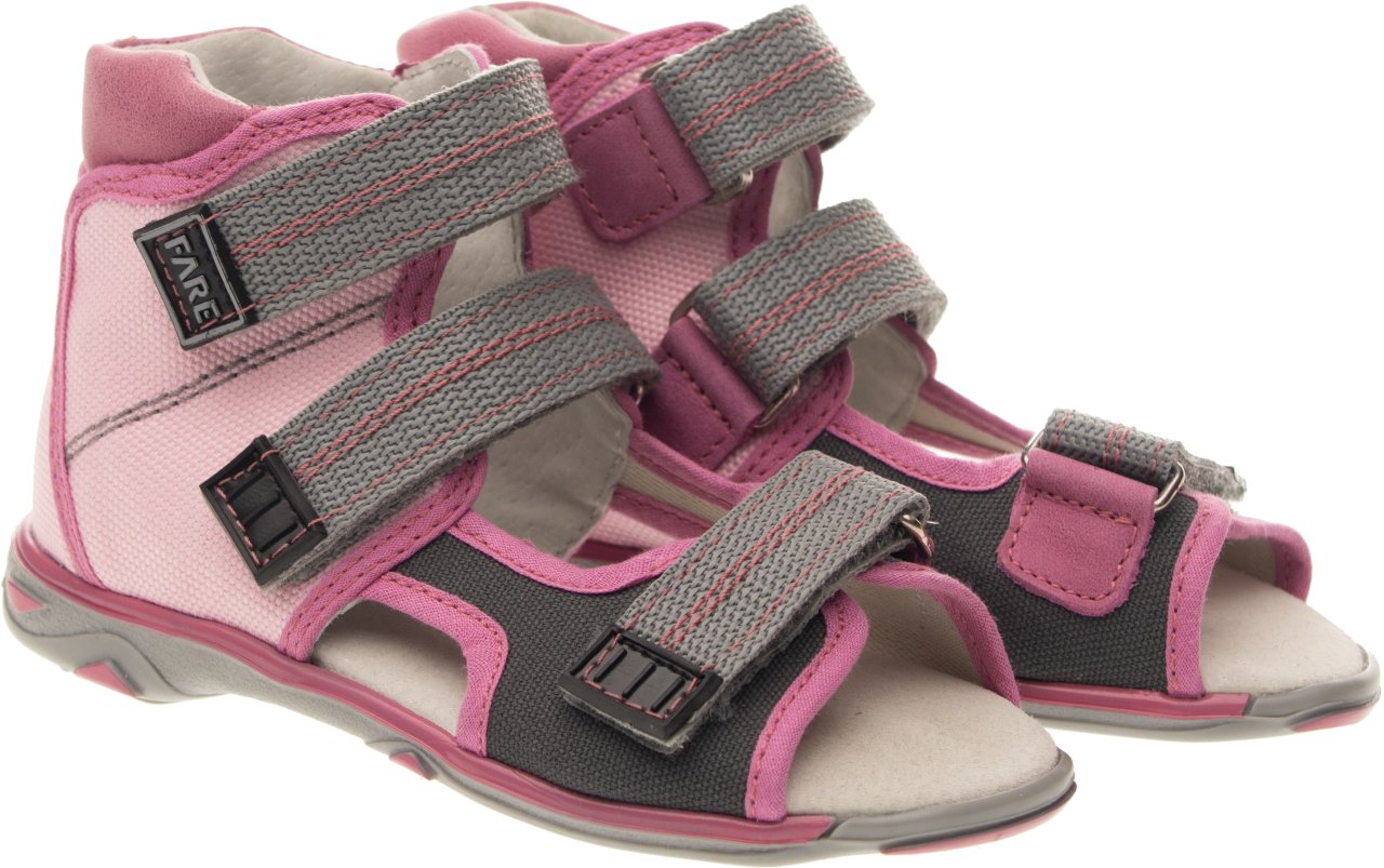 Sandálková obuv bez špice se zapínáním na velkro. Vrchový materiál - textil. Podšívka - pravá kůže. Podešev je z termoplastického kaučuku. Předností je vypolstrovaná stélka, regulovatelnost obuvi přes nárt a pevný opatek.