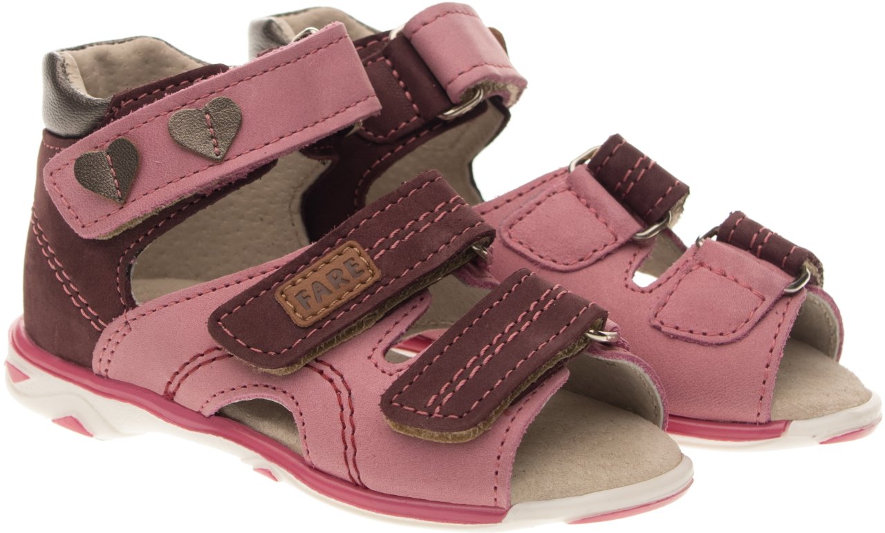 Sandálková obuv bez špice se zapínáním na velkro. Vrchový materiál – pravá kůže hladká v kombinaci s nubukem . Podšívka – pravá kůže. Podešev je z termoplastického kaučuku. Předností je vypolstrovaná stélka, regulovatelnost obuvi přes nárt, pevný opatek a výška paty, která je v souladu s podmínkami zdravého obouvání.