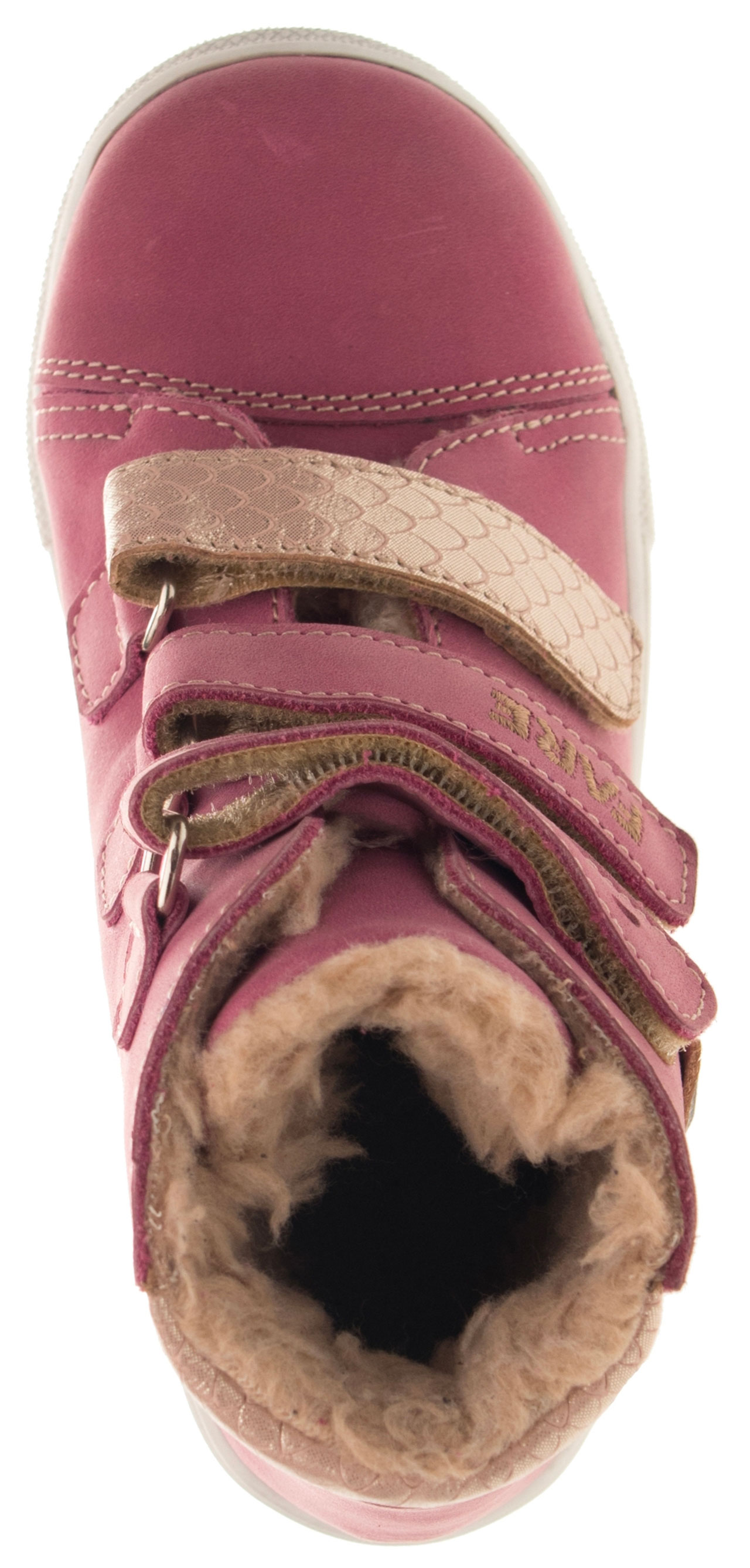 Zimní štróblovaná kotníčková obuv se zapínáním na suchý zip. Našívací (štróblovaná) stélka umožňuje lepší flexibilitu boty.Vrchový materiál: přírodní hovězinová useň lícová. Podšívka je zimní s hřejivým, středně dlouhým vlasem. Podešev je z termoplastického kaučuku, jehož složení splňuje parametry pro používání v zimním období. Předností je vyjímatelná vkládací stélka a pevný opatek i špice.