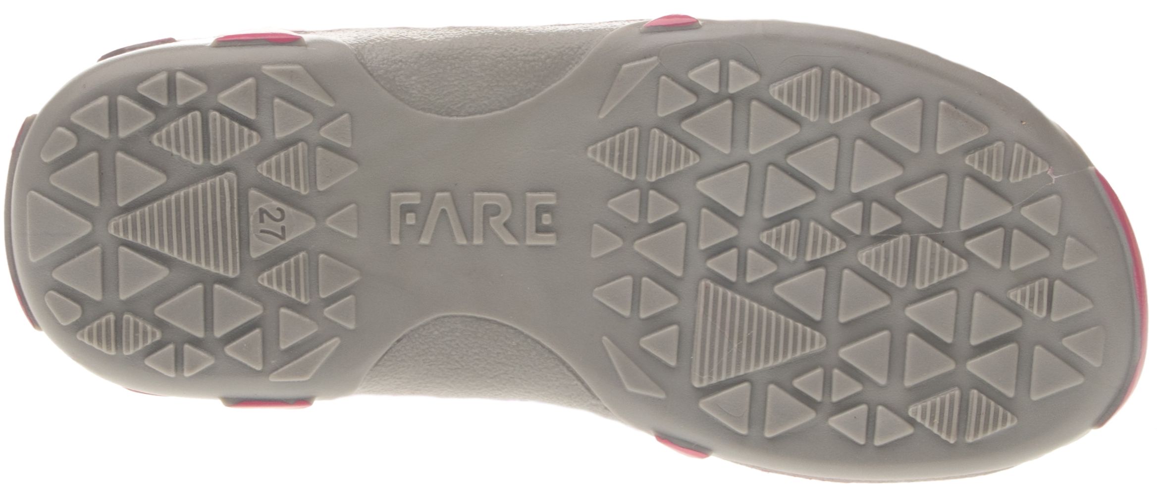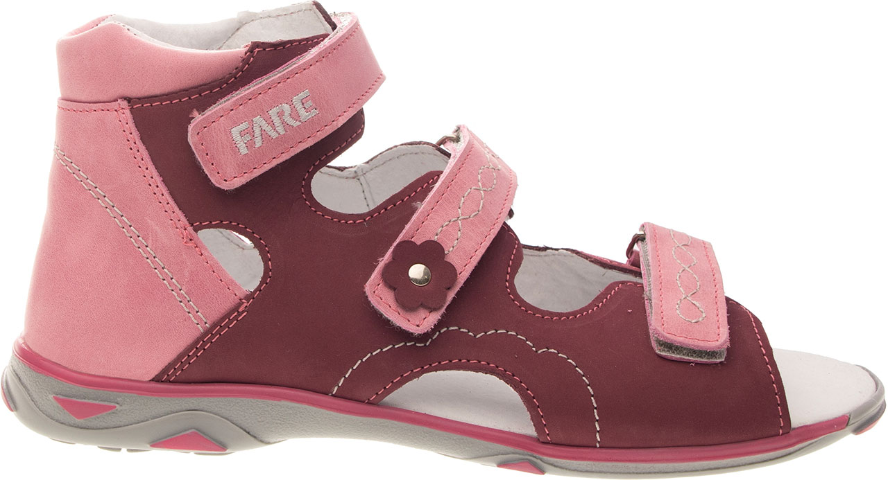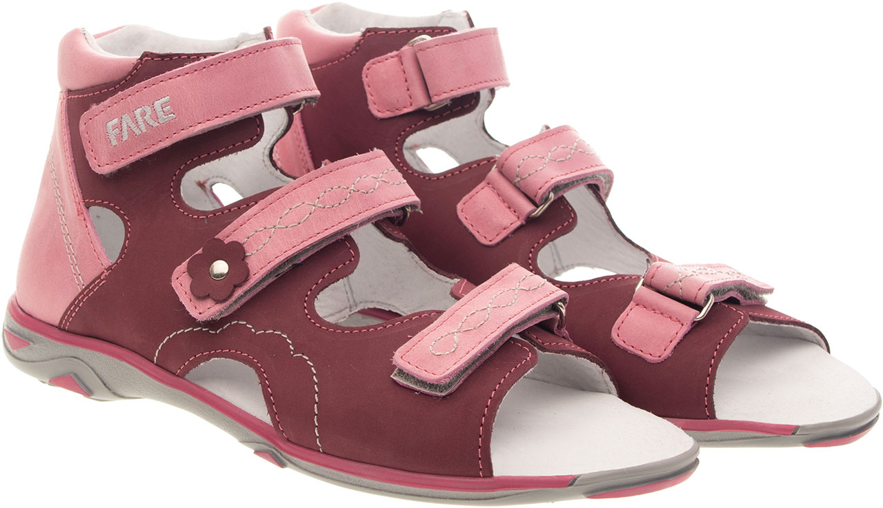 Sandálová obuv bez špice se zapínáním na velkro. Vrchový materiál - pravá kůže broušená v kombinaci s kůží hladkou. Podšívka - pravá kůže. Podešev je z termoplastického kaučuku. Předností je vypolstrovaná stélka, regulovatelnost obuvi přes nárt, pevný opatek a výška paty, která je v souladu s podmínkami zdravého obouvání.