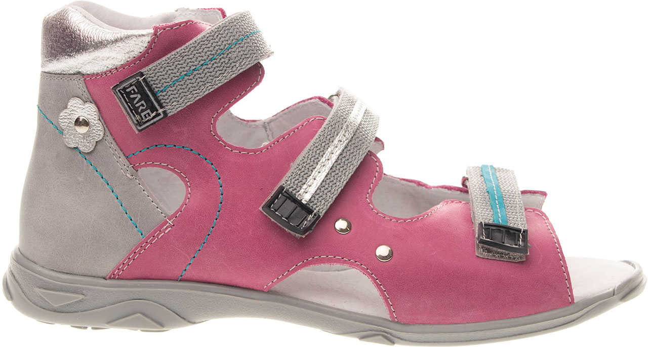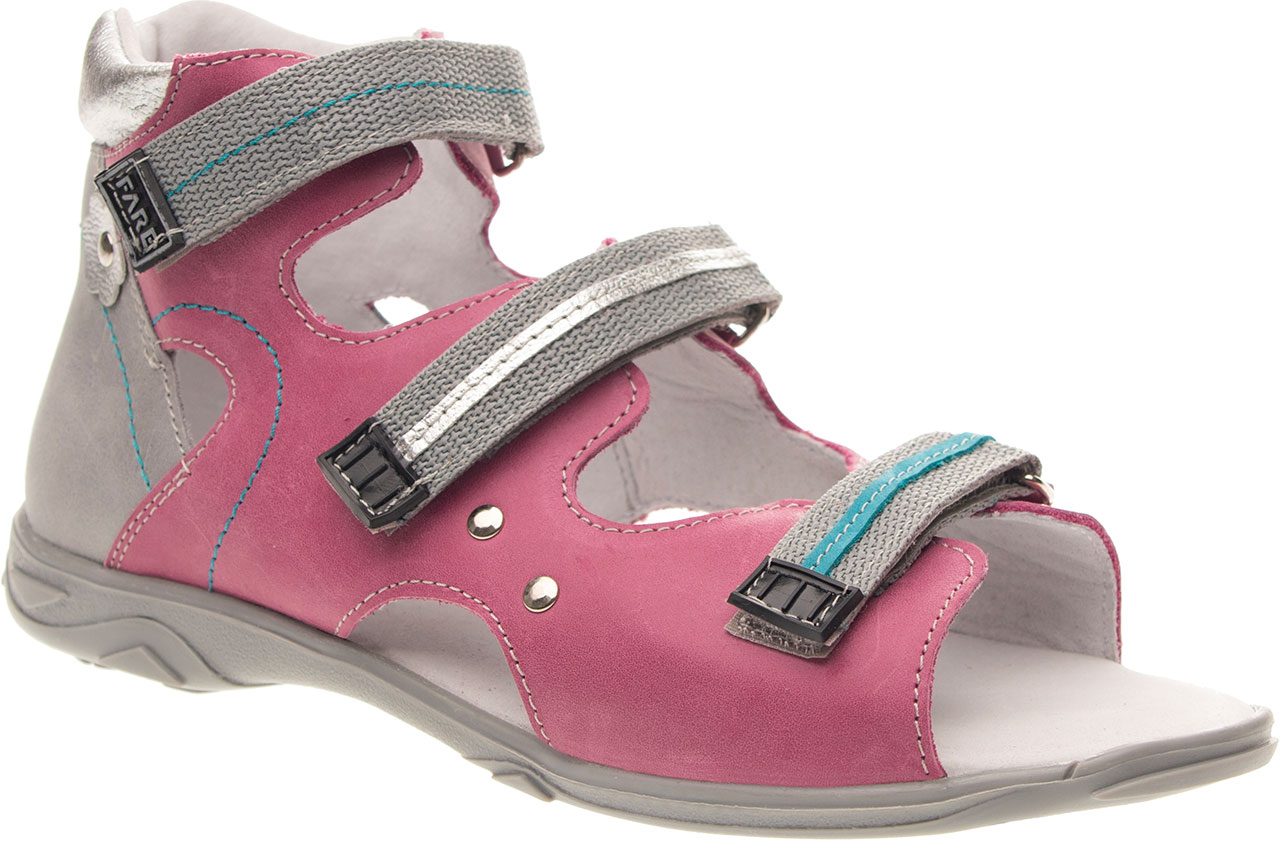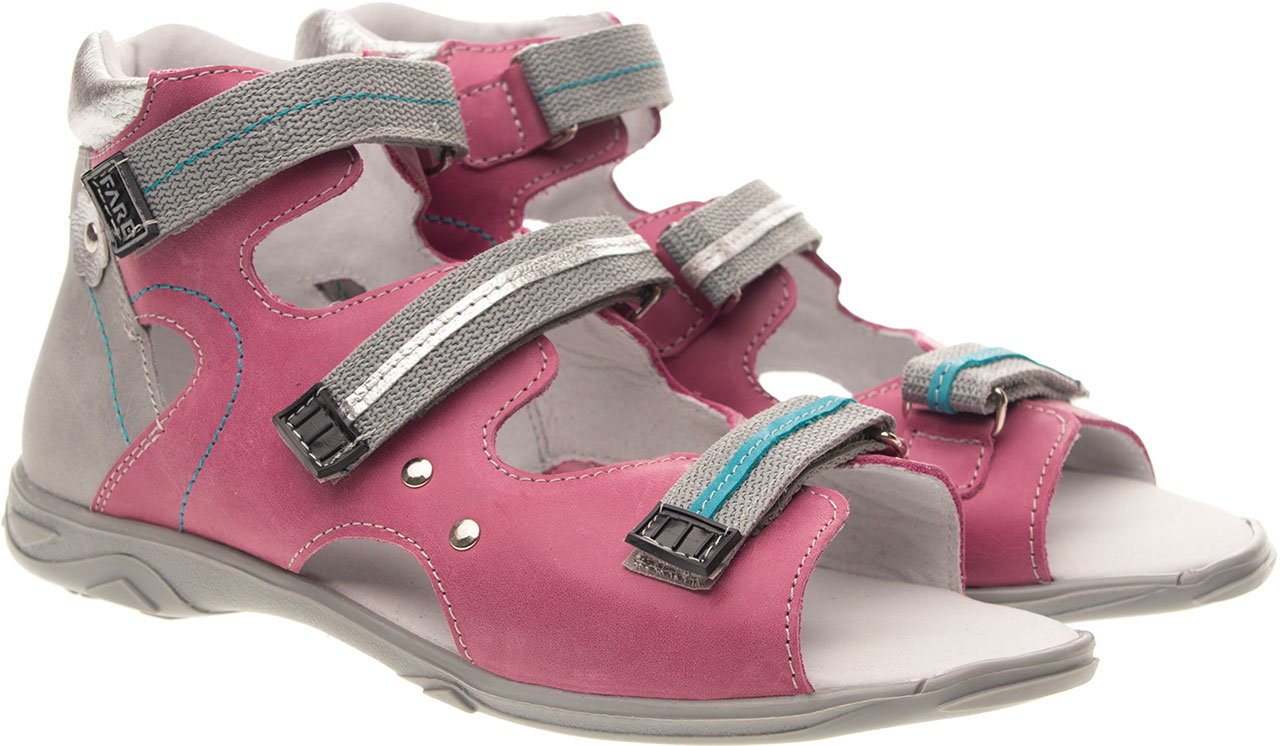 Sandálová obuv bez špice se zapínáním na velcro. Vrchový materiál - pravá kůže hladká. Podšívka - pravá kůže. Podešev je z termoplastického kaučuku. Předností je vypolstrovaná stélka, regulovatelnost obuvi přes nárt, pevný opatek a výška paty, která je v souladu s podmínkami zdravého obouvání.