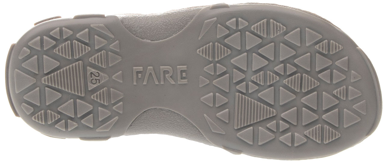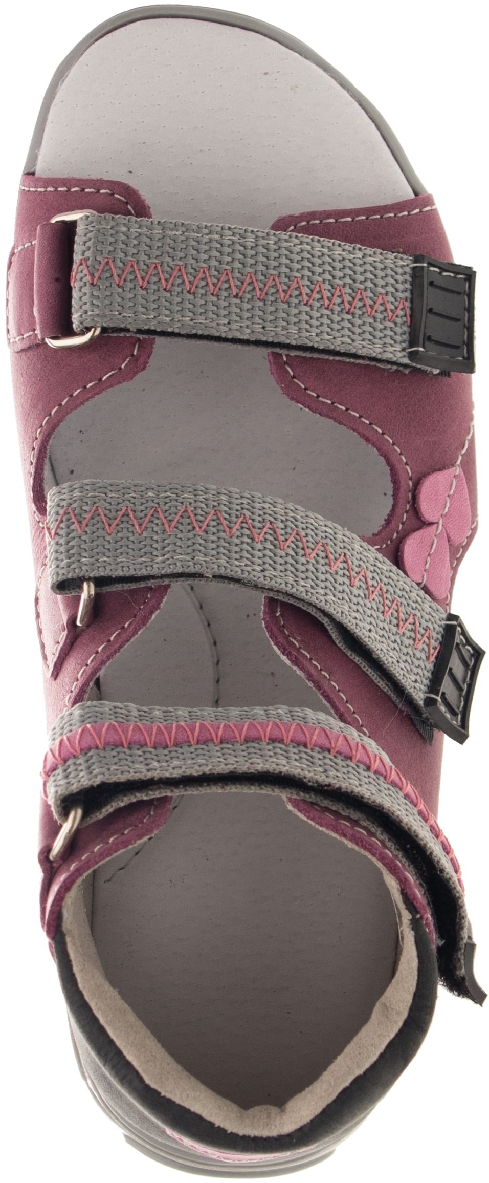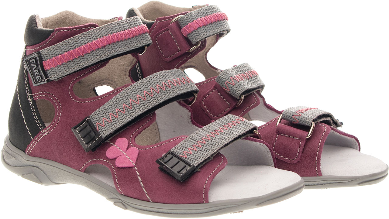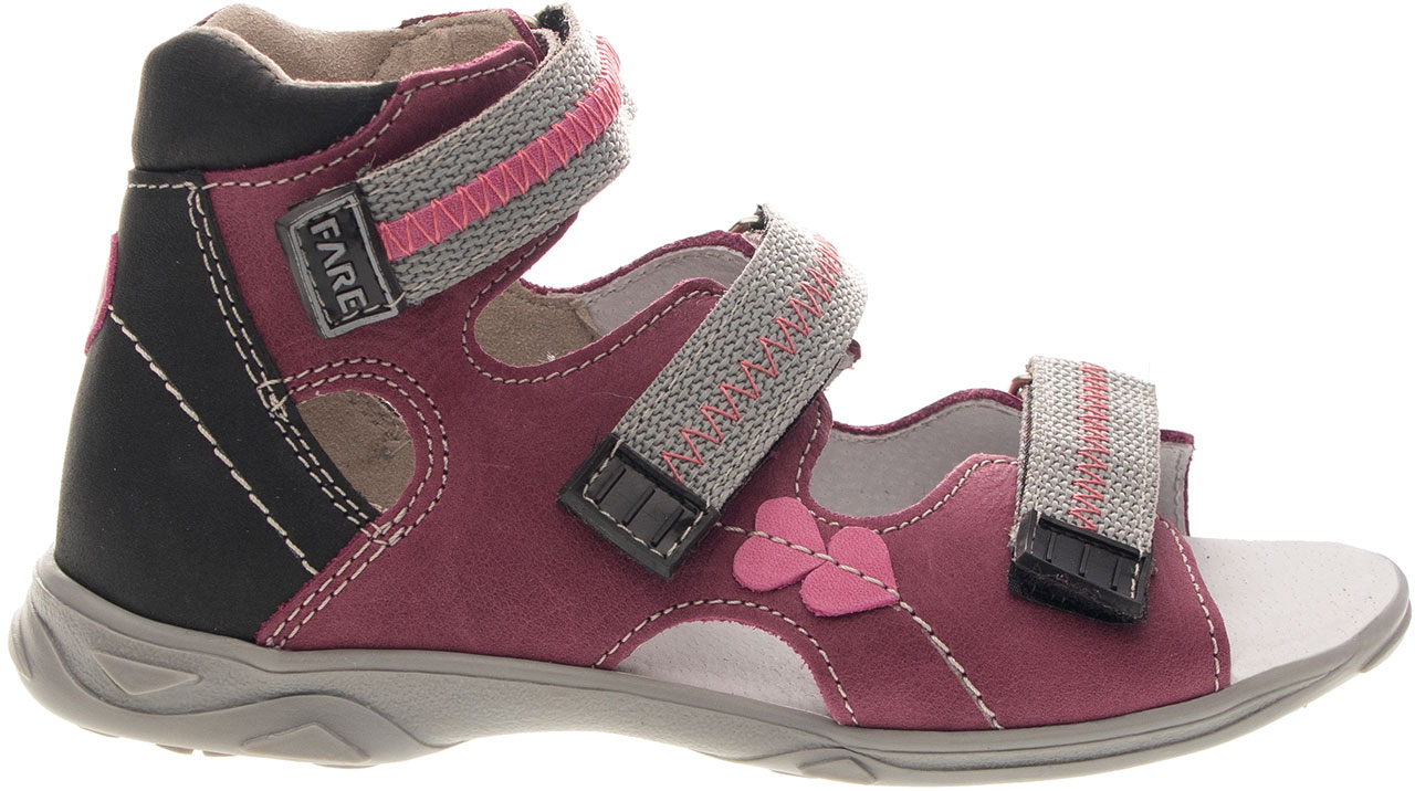 Sandálová obuv bez špice se zapínáním na velkro. Vrchový materiál - pravá kůže hladká. Podšívka - pravá kůže. Podešev je z termoplastického kaučuku. Předností je vypolstrovaná fuzbeta, regulovatelnost obuvi přes nárt, pevný opatek a výška paty, která je v souladu s podmínkami zdravého obouvání.