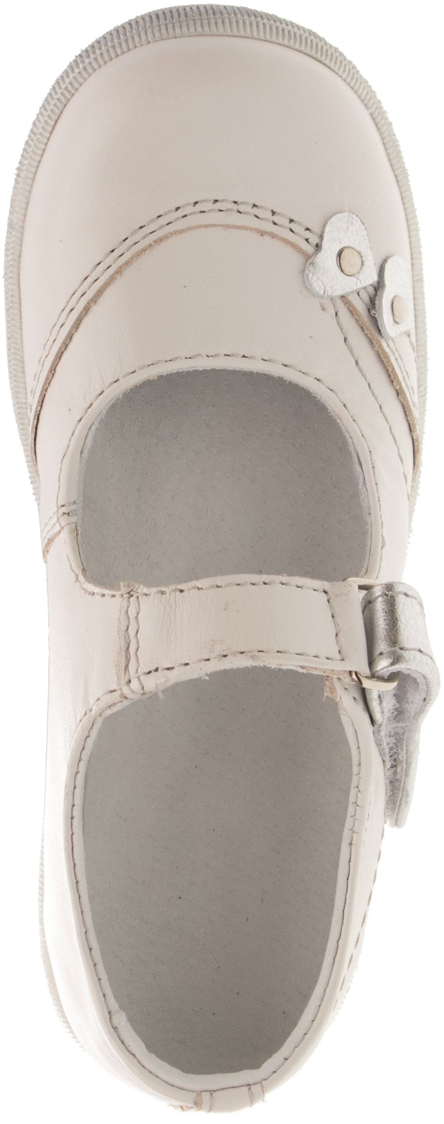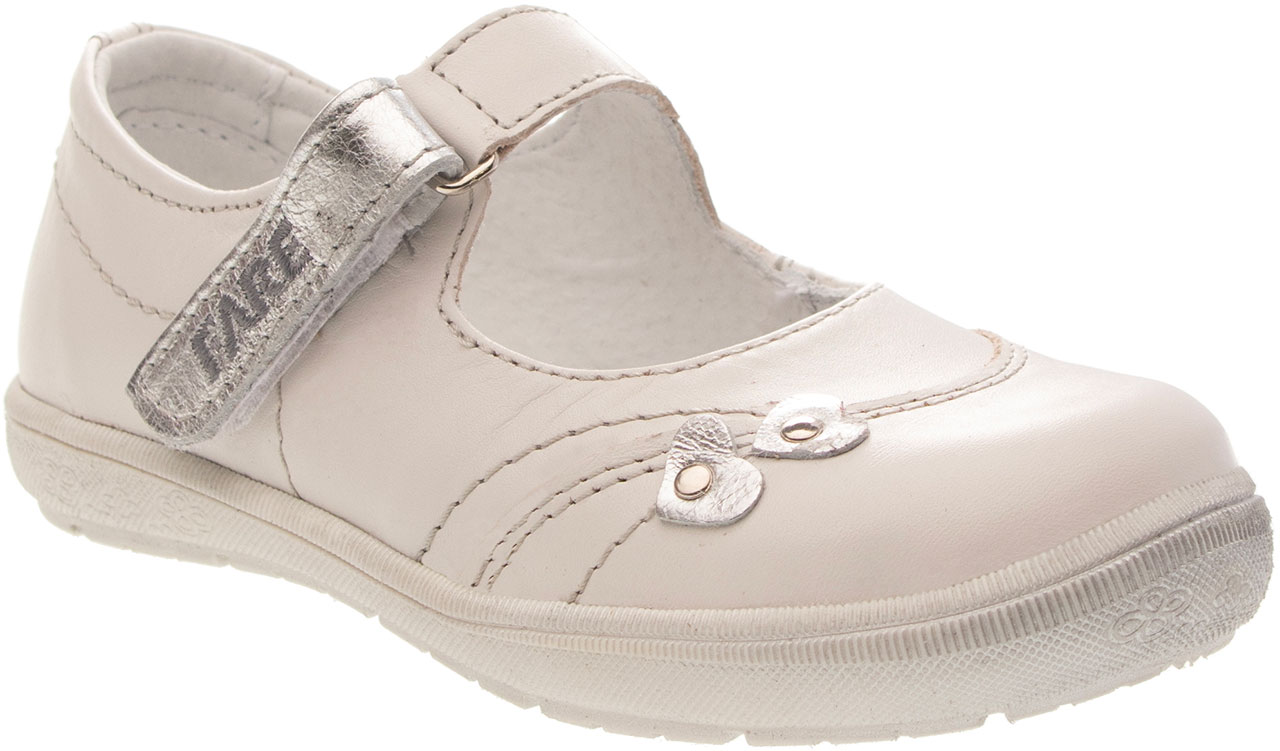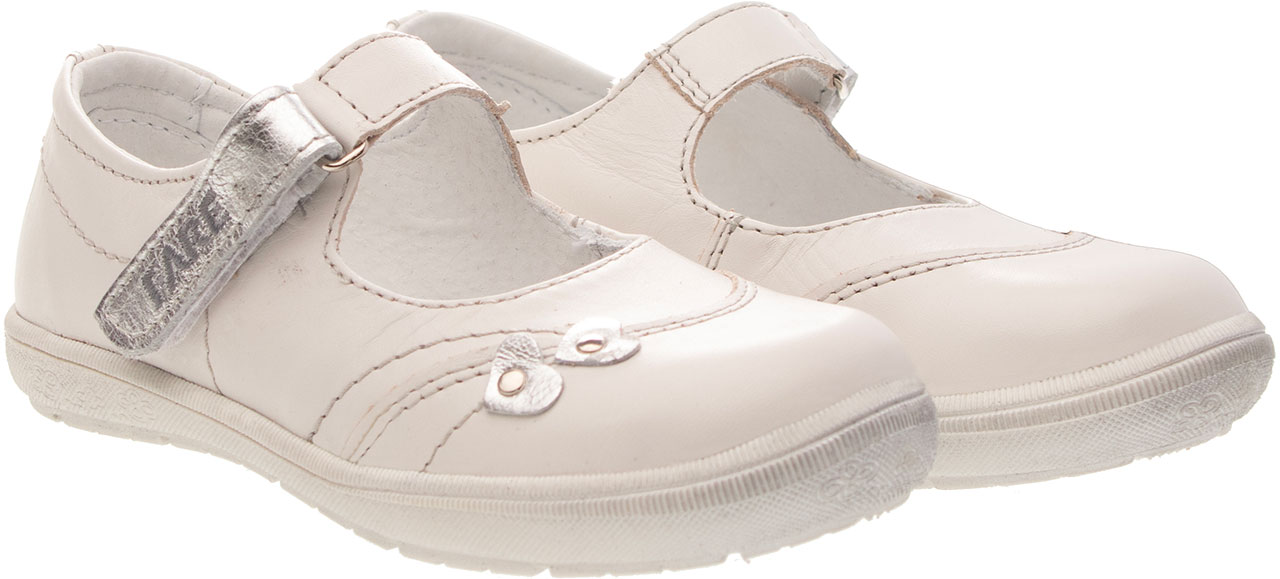 Dívčí střevíček se zapínacím páskem na velkro. Vrchový materiál - pravá kůže hladká. Podšívka je vyrobena z usně. Podešev je vyrobena z termoplastického kaučuku. Předností je vyjímatelná vkládací stélka a pevný opatek i špice.