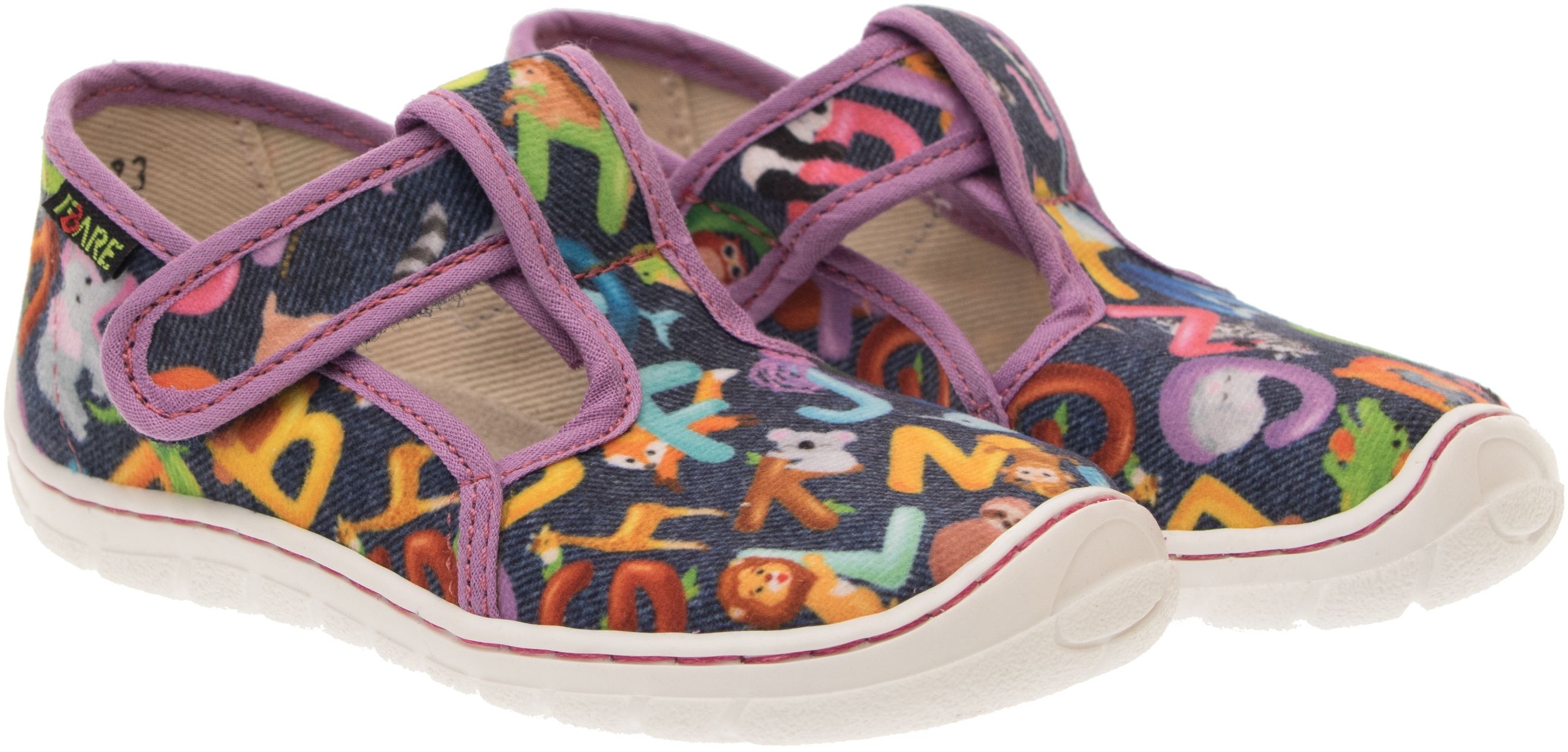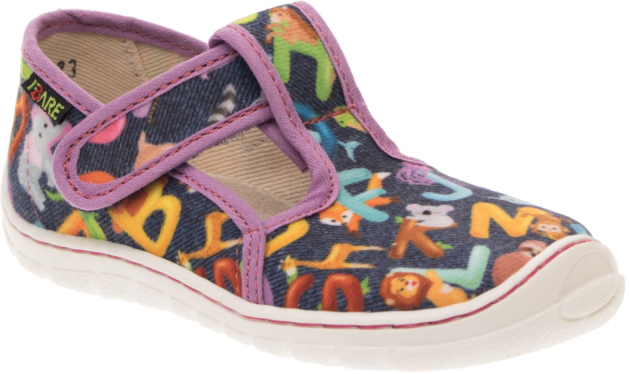 Dětská domácí/přezůvková štróblovaná obuv na suchý zip. Našívací (štróblovaná) stélka umožňuje lepší ohyb boty. Vrchový materiál: textil. Podešev je vyrobena z termokaučuku, který je velmi flexibilní příčně, ale i podélně.