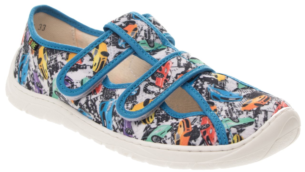 Dětská domácí/přezůvková štróblovaná obuv na suchý zip. Našívací (štróblovaná) stélka umožňuje lepší ohyb boty. Vrchový materiál: textil. Podešev je vyrobena z termokaučuku, který je velmi flexibilní příčně, ale i podélně.