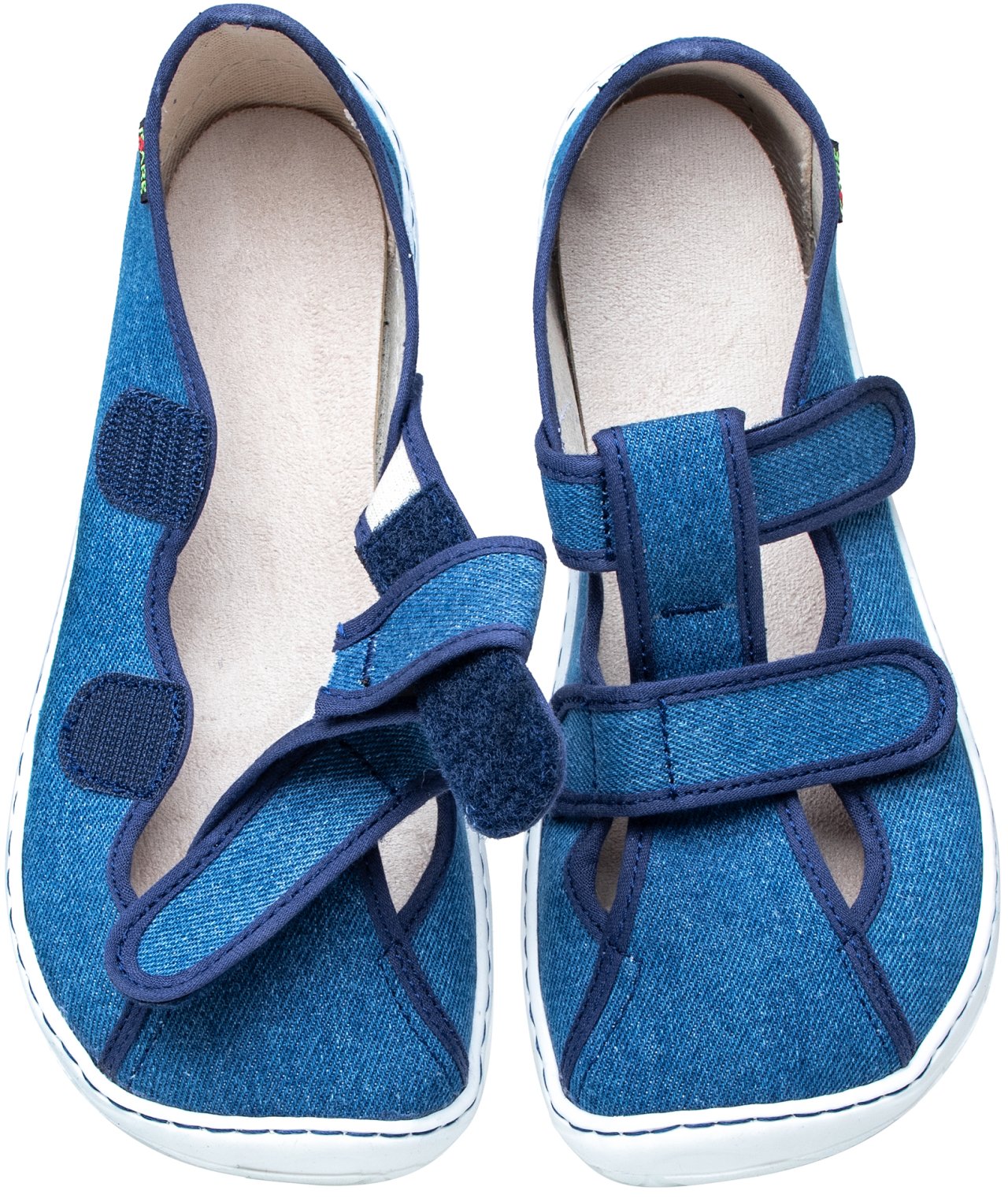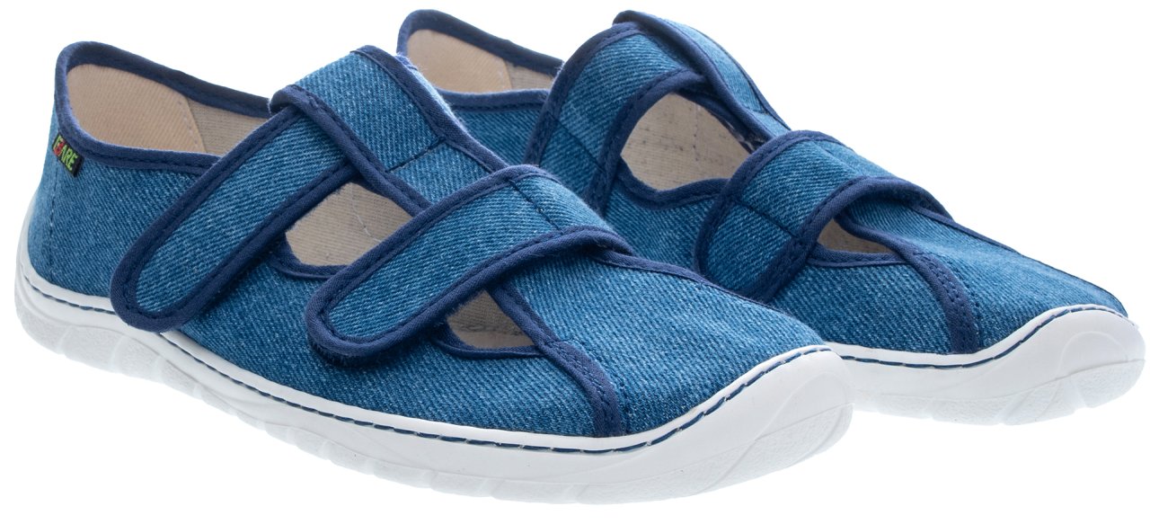 Dětská domácí/přezůvková štróblovaná obuv na suchý zip. Našívací (štróblovaná) stélka umožňuje lepší ohyb boty. Vrchový materiál: textil. Podešev je vyrobena z termokaučuku, který je velmi flexibilní příčně, ale i podélně.