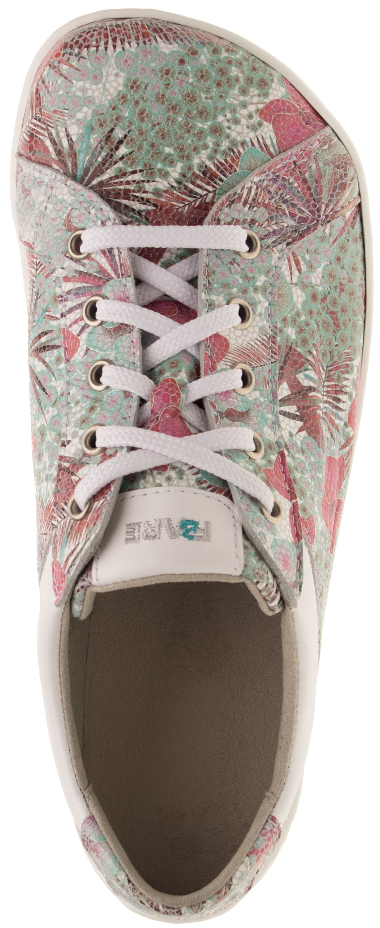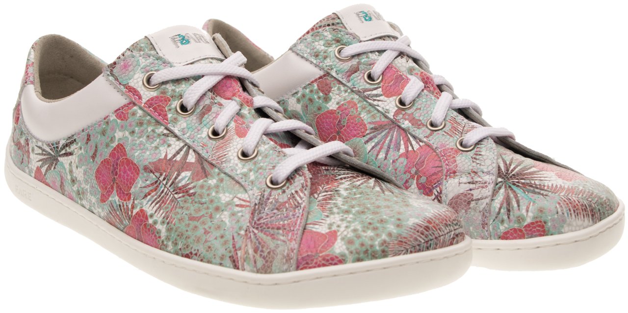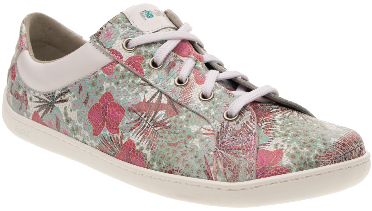 Svršek z pravé hladké hovězinové kůže s květinovým vzorem zajišťuje dostatečnou odolnost a zároveň příjemný pocit při nošení. Anatomický barefoot tvar poskytuje dostatek prostoru pro prsty a podporuje jejich přirozenou práci při chůzi. Střih je vhodný pro středně vysoký a vyšší nárt, což napomáhá správnému usazení nohy v botě bez zbytečného tlaku.