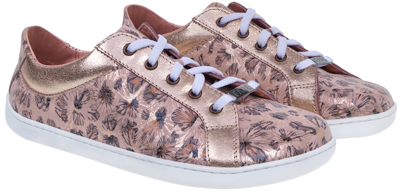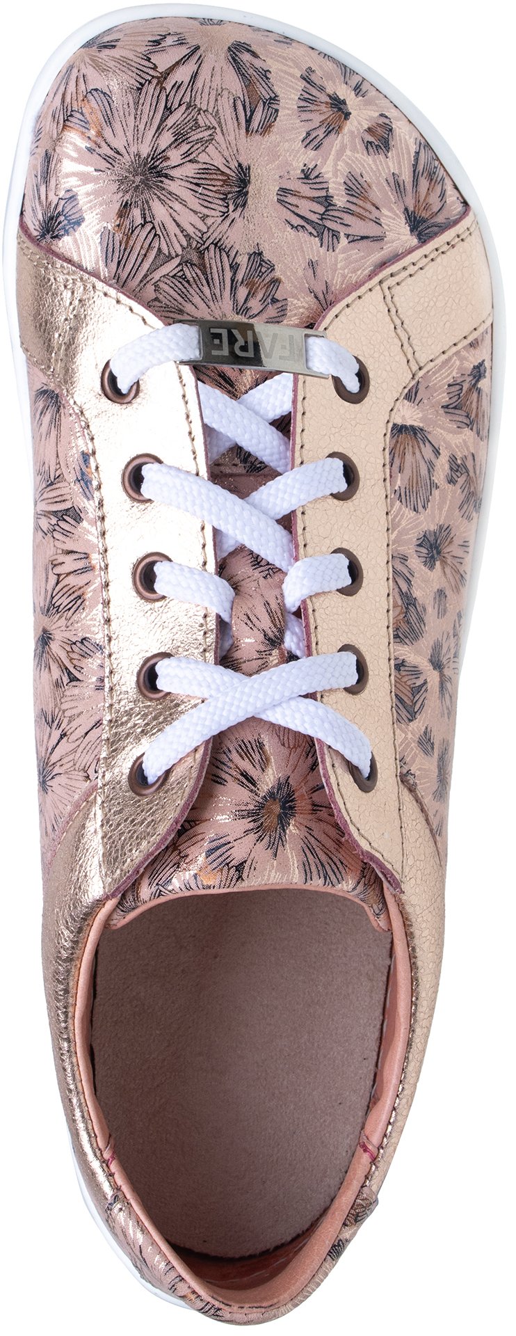 Svršek z pravé hladké hovězinové kůže s květinovým vzorem zajišťuje dostatečnou odolnost a zároveň jemně výrazný vzhled. Anatomický barefoot tvar poskytuje dostatek prostoru pro prsty a podporuje jejich přirozenou práci při chůzi. Střih je vhodný pro středně vysoký a vyšší nárt, což napomáhá správnému usazení nohy v botě.