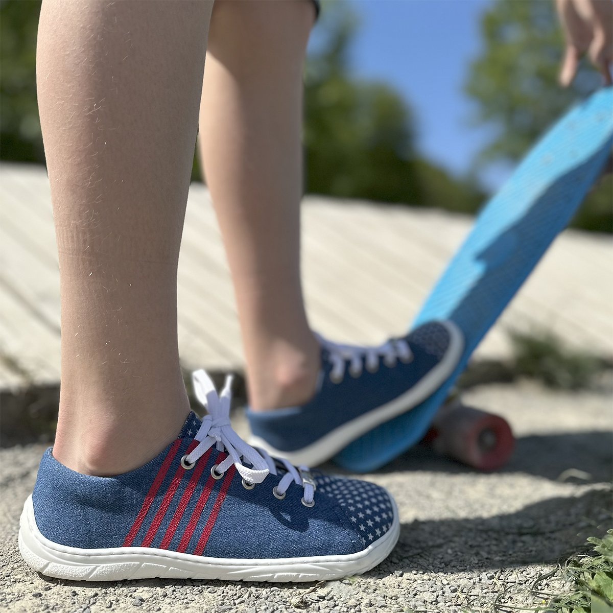 Hledáte lehké, pohodlné a zároveň stylové barefootové tenisky pro své dítě? Modré džínové tenisky FARE BARE „Sicilky“ zaujmou na první pohled hravým designem – boky zdobí výrazné červené pruhy a špičku bílé hvězdičky, které z nich dělají opravdový originál. Dopřejte svým dětem barefootovou svobodu pro rostoucí nožky.
