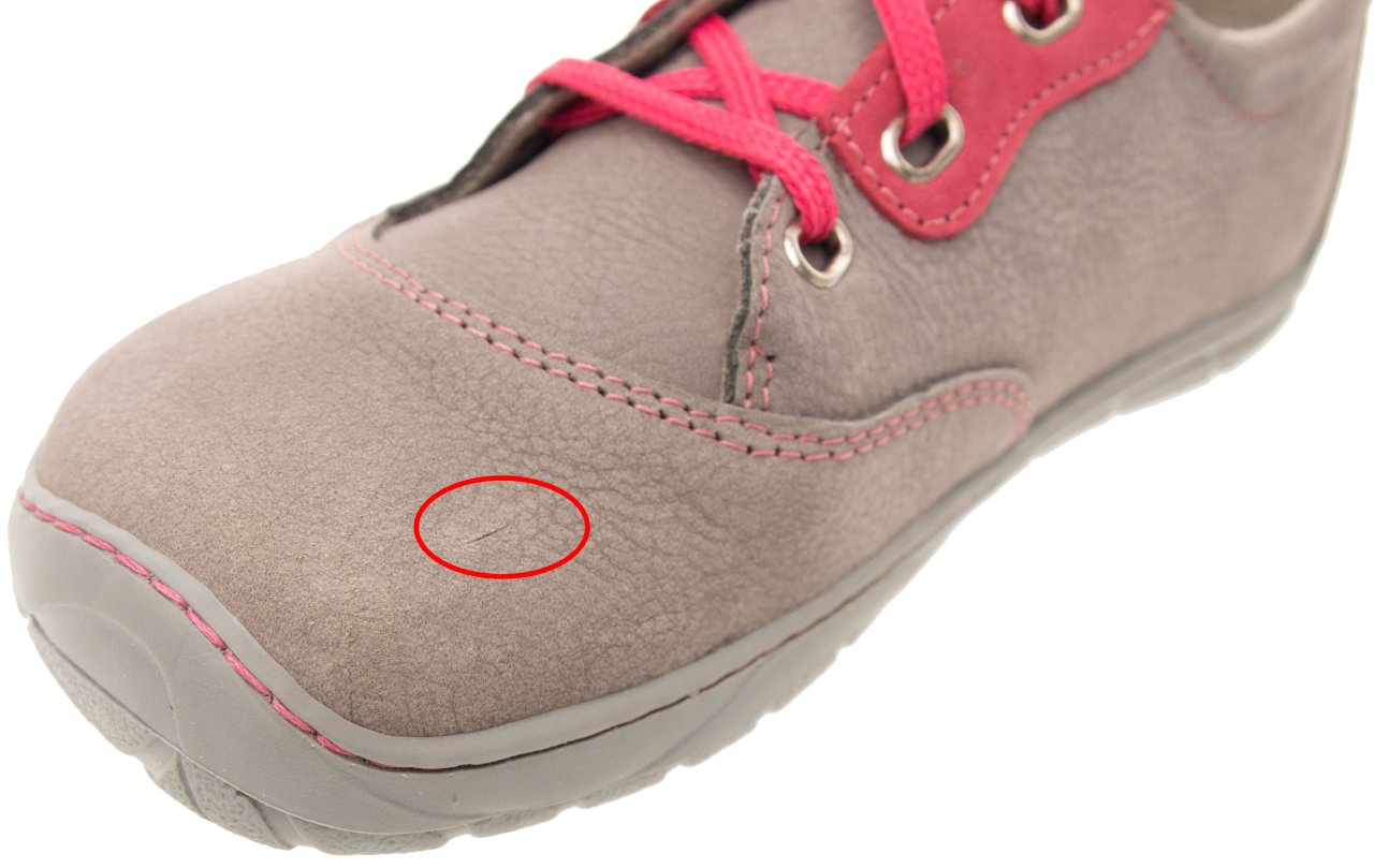 Jedná se o plnohodnotnou obuv z hlediska kvalitativního. Obuv je zlevněna z důvodu vady na pravé špici - viz foto. Jedná se pouze o estetickou vadu.