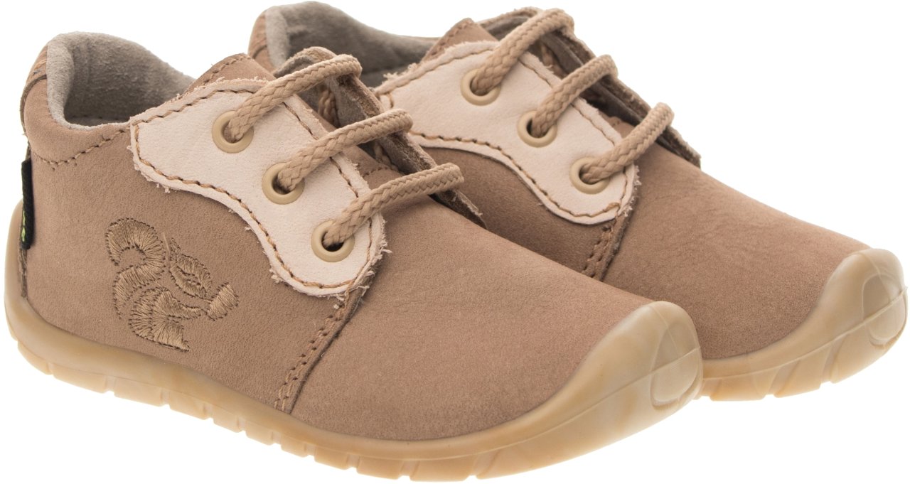 Dětská štróblovaná obuv, šněrovací. Našívací (štróblovaná) stélka umožňuje lepší ohyb boty. Vrchový materiál: hovězinová useň broušená (nubuk).Podšívka: textilní materiál s výbornými sacími schopnostmi. Podešev je vyrobena z termokaučuku, který je velmi flexibilní příčně, ale i podélně.