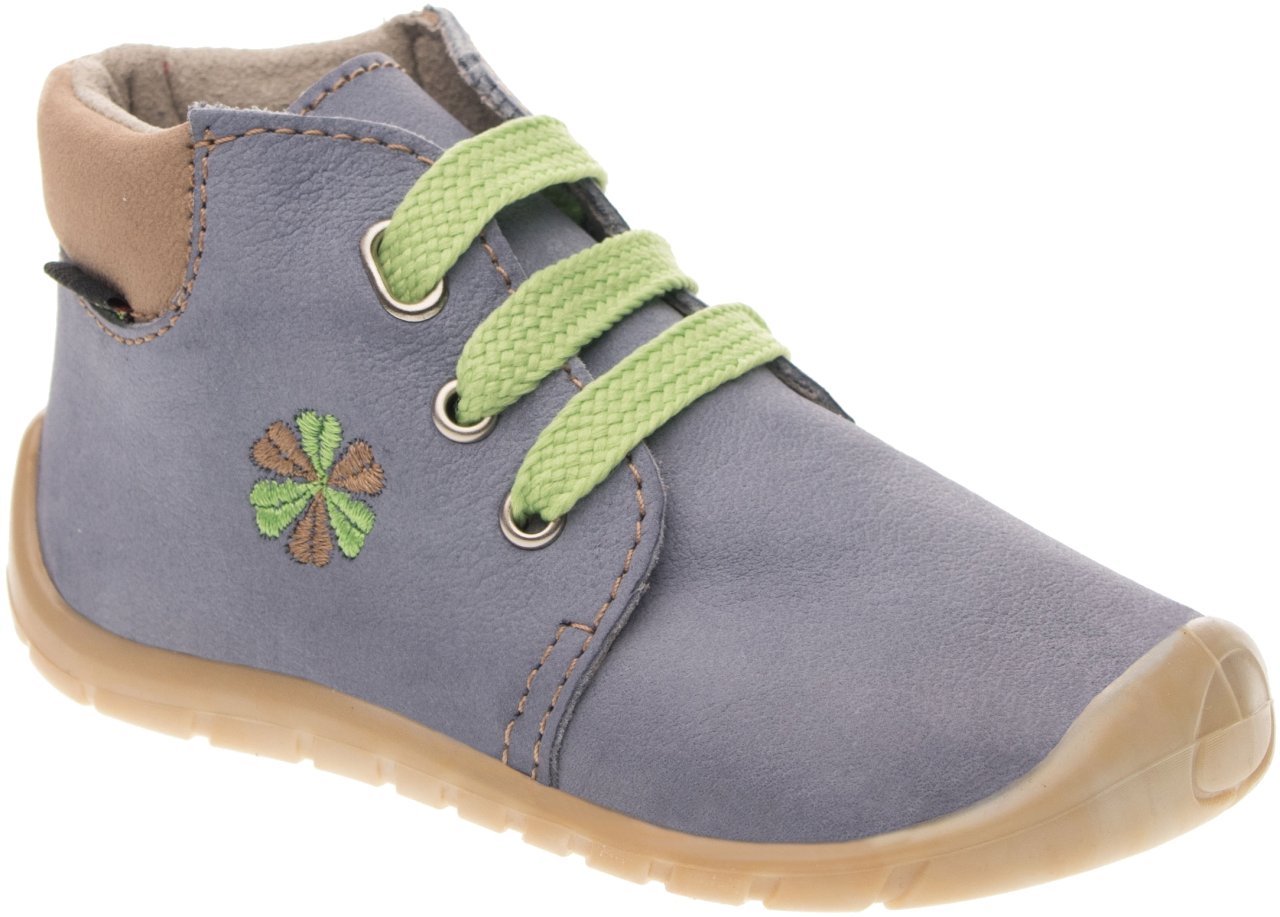 Dětská štróblovaná obuv, šněrovací. Našívací (štróblovaná) stélka umožňuje lepší ohyb boty. Vrchový materiál: hovězinová useň broušená (nubuk).Podšívka: textilní materiál s výbornými sacími schopnostmi. Podešev je vyrobena z termokaučuku, který je velmi flexibilní příčně, ale i podélně.