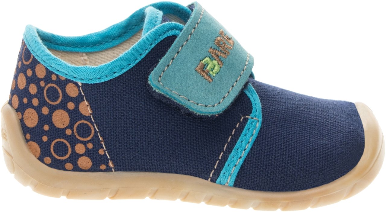 Dětská štróblovaná obuv na suchý zip. Našívací (štróblovaná) stélka umožňuje lepší ohyb boty. Vrchový materiál: textil. Podšívka: bez podšívky. Podešev je vyrobena z termokaučuku, který je velmi flexibilní příčně, ale i podélně.
