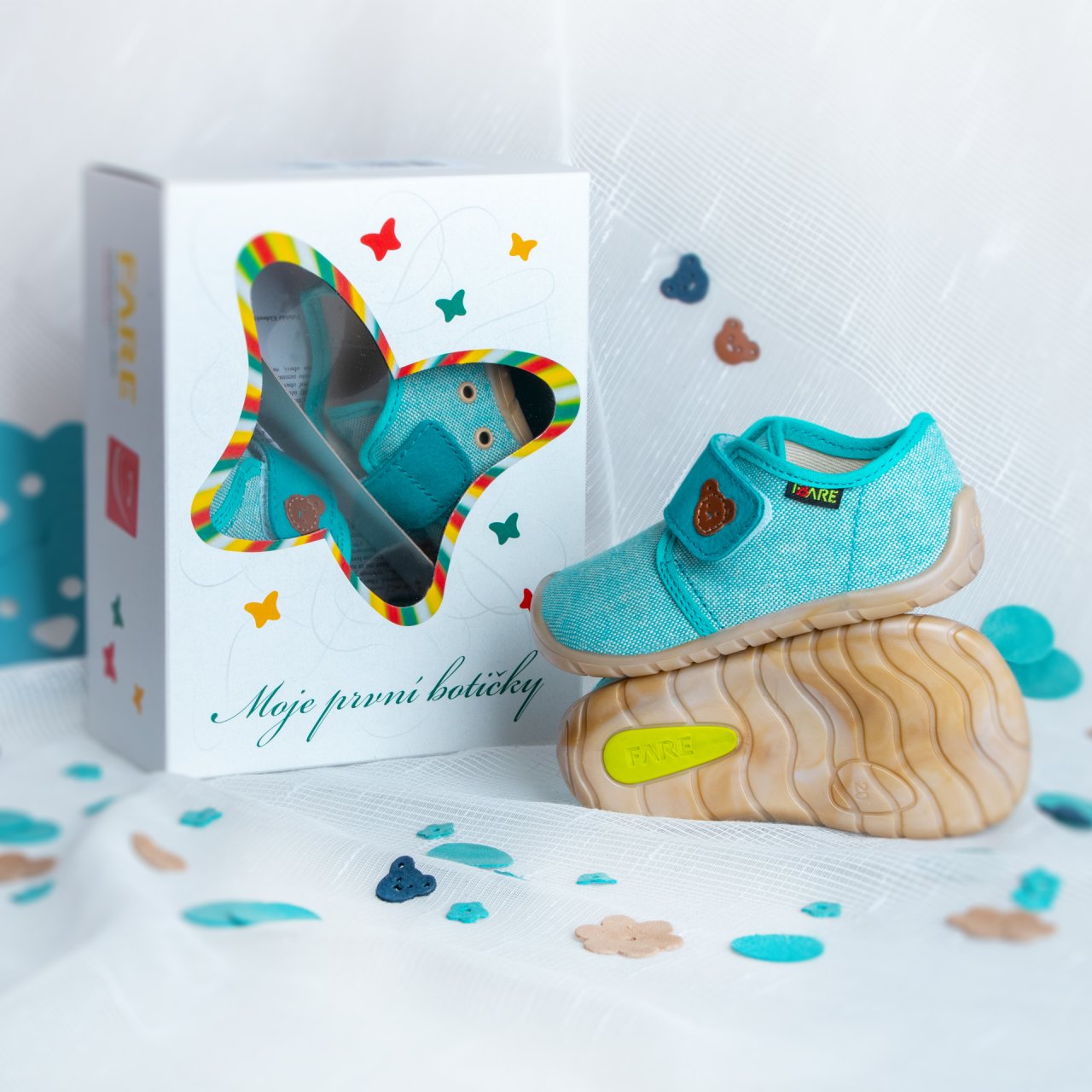 Ultratenká a mimořádně měkká konstrukce podporuje přirozený vývoj dětského chodidla, cit pro povrch a svobodný pohyb nožky. Podešev byla navržena ve FARE ve Valašských Kloboukách s maximálním důrazem na bezpečnost, funkčnost a barefoot principy.