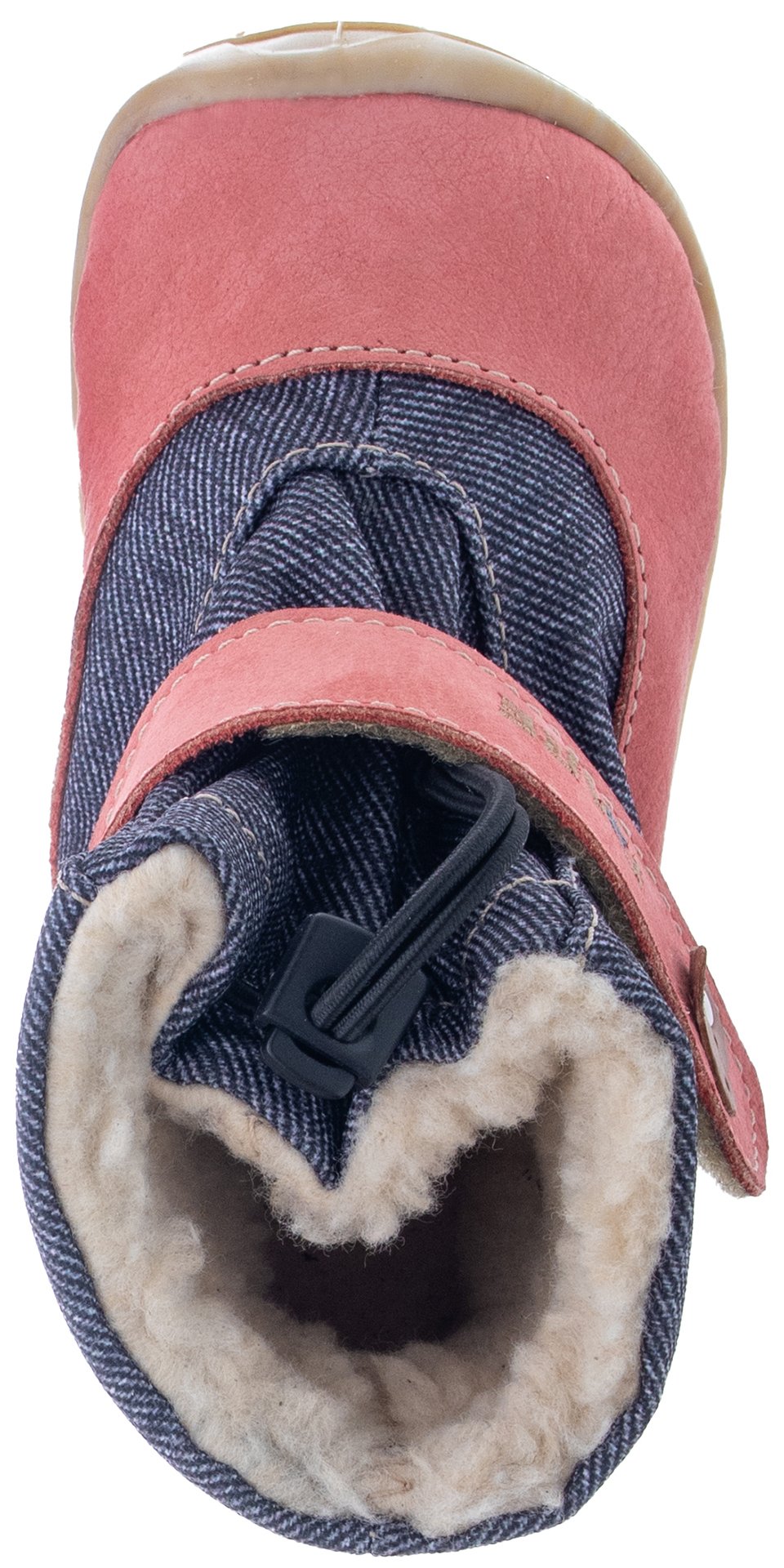 Zimní štróblovaná kotníčková obuv se zapínáním na gumolanko a suchý zip. Našívací (štróblovaná) stélka umožňuje lepší ohyb boty. Vrchový materiál: hovězinová useň broušená (nubuk). Podšívka: jemný zimní plyš. Podešev je vyrobena z termokaučuku, který je velmi flexibilní příčně, ale i podélně. Obuv je opatřena nástřikem proti nasákavosti vody, obuv není vybavena membránou.