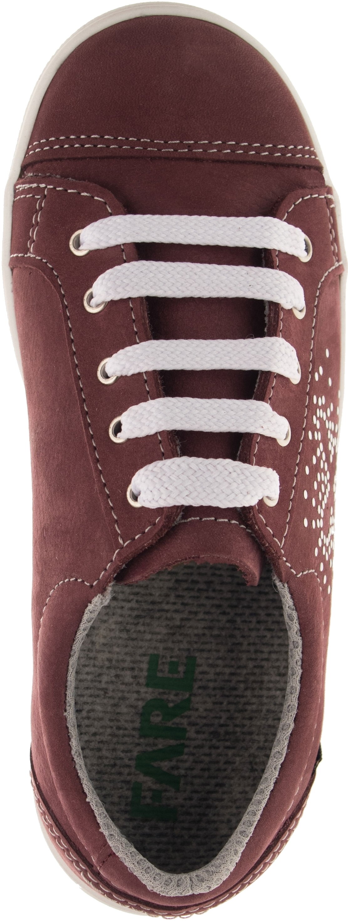 Celoroční, vycházková obuv, nízká, šněrovací. Vrchový materiál - pravá kůže broušená. Podšívka - textilní. Podešev je z termoplastického kaučuku s módním dezénem a zvednutou špicí. Obuv má pevný opatek i špici, předností je vyjímatelná vkládací stélka.