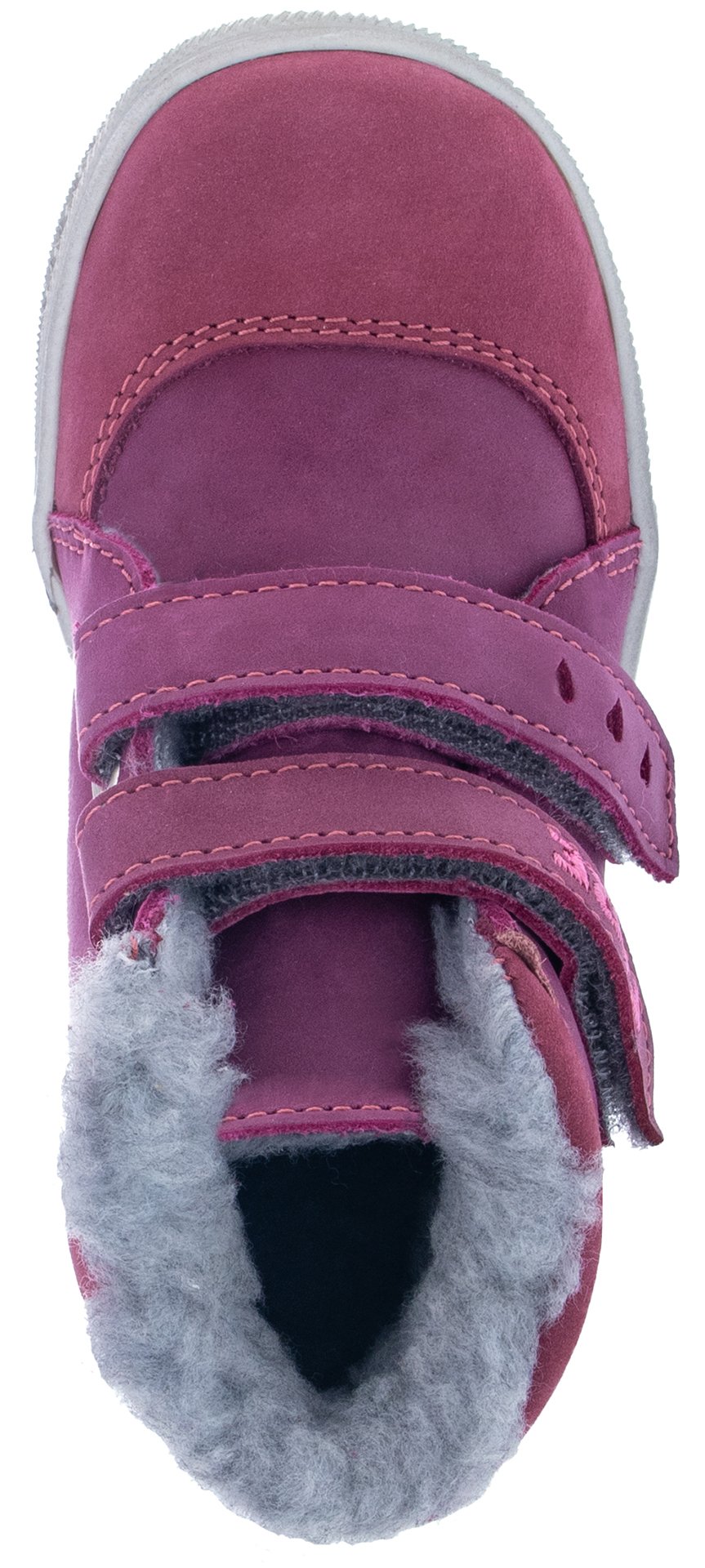 Zimní boty z úsně v dívčí kotníčkové boty v burgundové barvě s ozdobným páskem, růžovým prošitím a výšivkou loga. Pohodlné zapínání na suchý zip zajistí snadné obouvání, plyšová podšívka udrží nohy v teple i v chladivých dnech. Velikostní tabulku s přesnými rozměry pro přeměření chodidla naleznete níže.