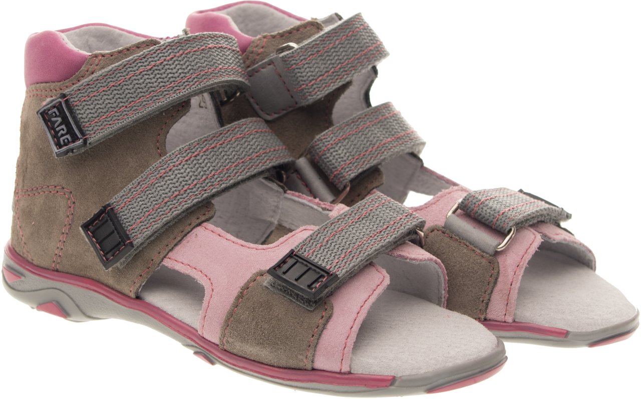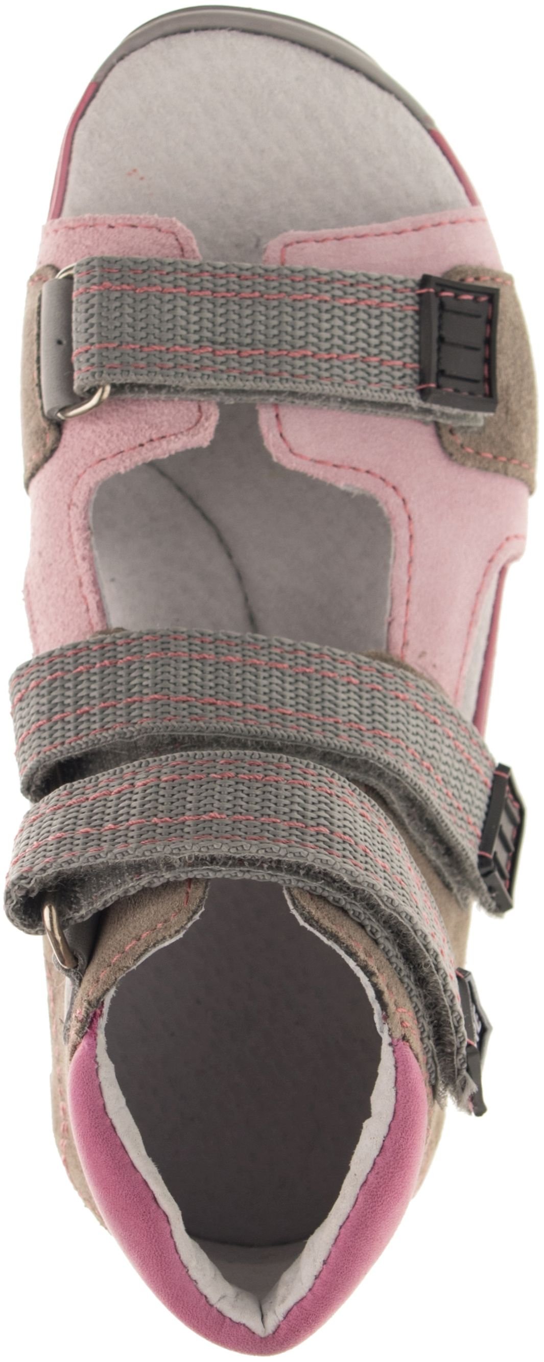 Sandálková obuv bez špice se zapínáním na velkro. Vrchový materiál – pravá broušená kůže. Podšívka – pravá kůže. Podešev je z termoplastického kaučuku. Předností je vypolstrovaná stélka, regulovatelnost obuvi přes nárt, pevný opatek a výška paty, která je v souladu s podmínkami zdravého obouvání.