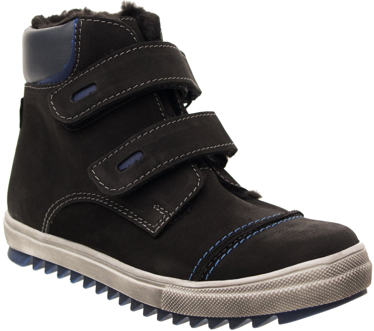 Zimní kotníčková obuv se zapínáním na suchý zip. Vrchový materiál: přírodní hovězinová useň broušená (nubuk). Podšívka je zimní s hřejivým, středně dlouhým vlasem. Podešev je z termoplastického kaučuku, jehož složení splňuje parametry pro používání v zimním období. Předností je vyjímatelná vkládací stélka a pevný opatek i špice.