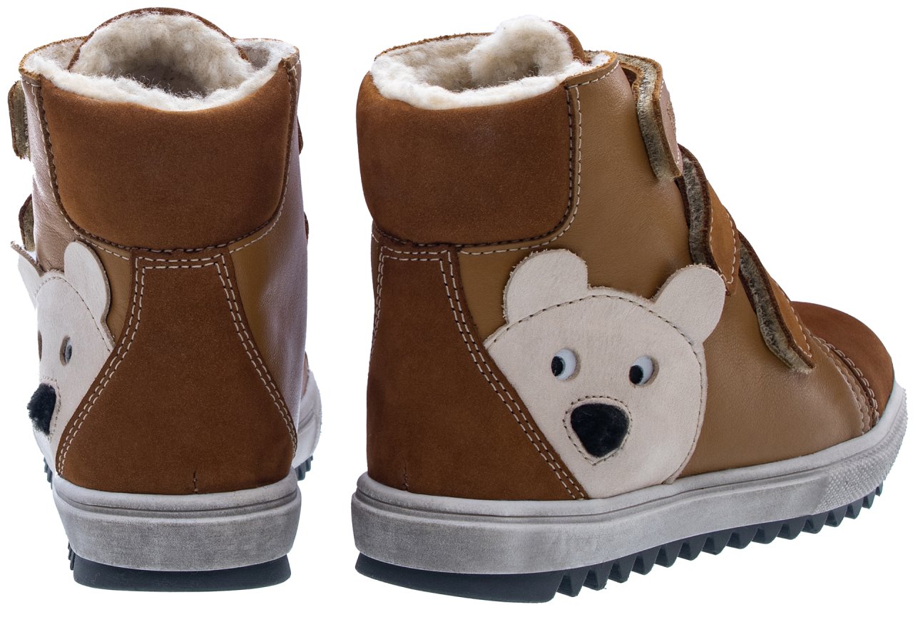 Kvalitní kotníčková kožená obuv, která okouzlí nejen svým stylovým vzhledem, ale i kvalitním zpracováním a promyšleným střihem. Boty jsou doplněny aplikací medvěda, což přidává špetku hravosti. Díky snadnému zapínání na suché zipy zvládnou děti boty pohodlně obout samy. Zimní podšívka s hřejivým středně dlouhým vlasem zajistí, že dětská chodidla zůstanou v teple a pohodlí i během chladných dní.