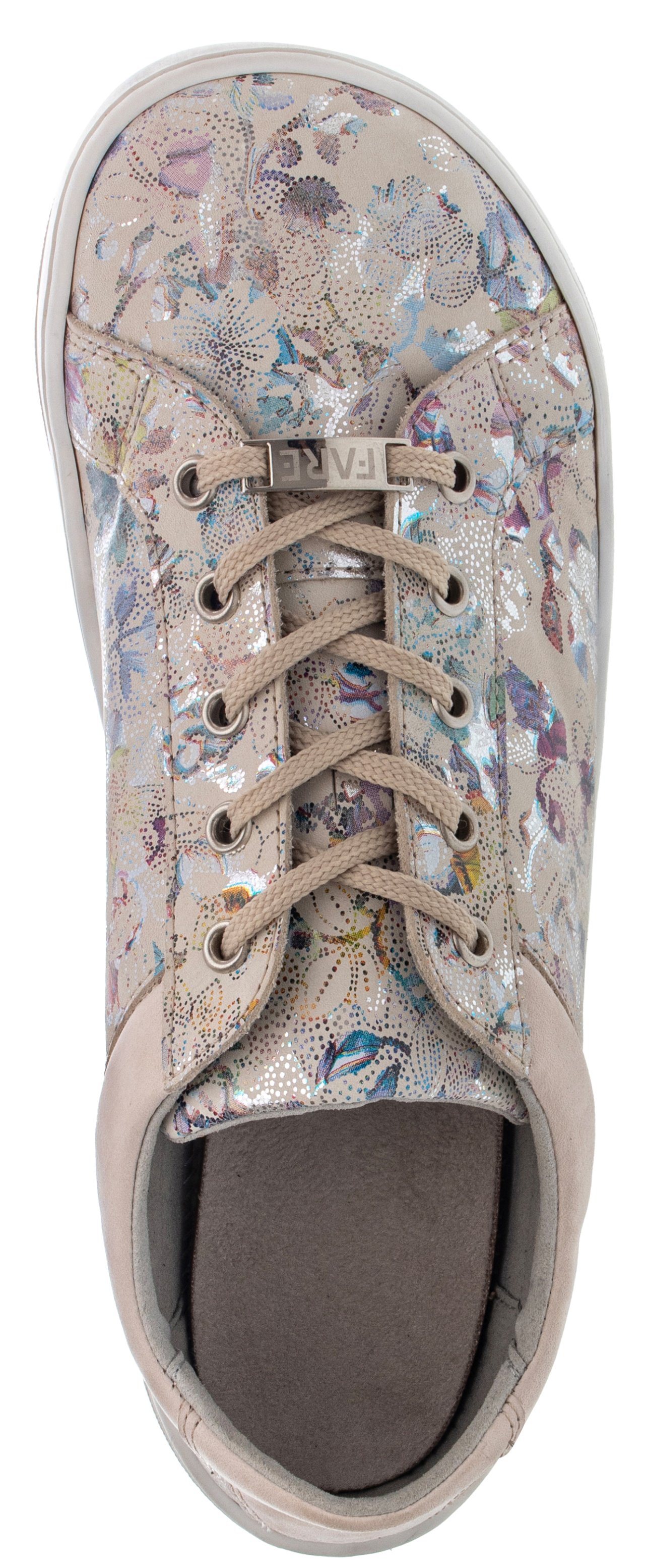 Tenisky ELEGANT v béžové barvě a kombinací květů jsou ideální volbou pro pohodlný a stylový outfit. Tento model je součástí naší celoroční obuvi značky FARE MID-WIDE, která má anatomicky tvarovanou špičku. Vnitřní materiál je hebký a má vynikající sací schopnosti, vnější strana obuvi pokrývá kvalitní hovězinová useň, která zaručuje dlouhou životnost a odolnost obuvi. Bílá podešev je flexibilní o tloušťce 3-4mm. Tenisky jsou na zavazování - zdobeny ozdobnou provlékací sponou FARE.