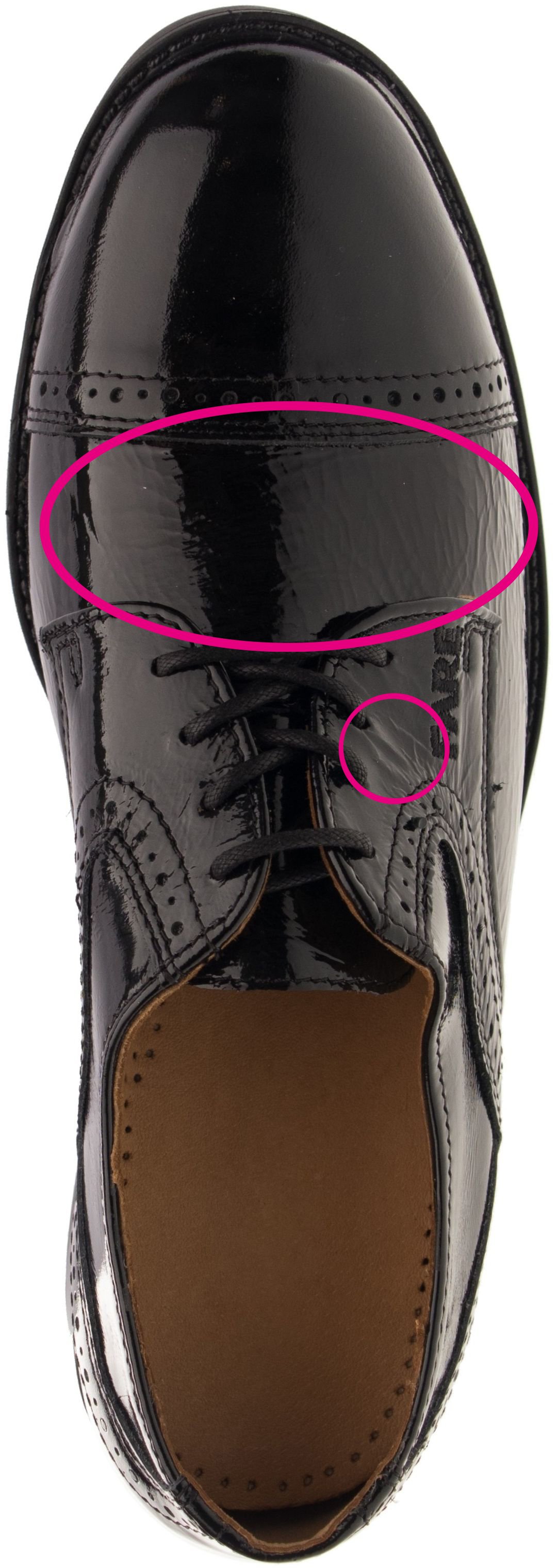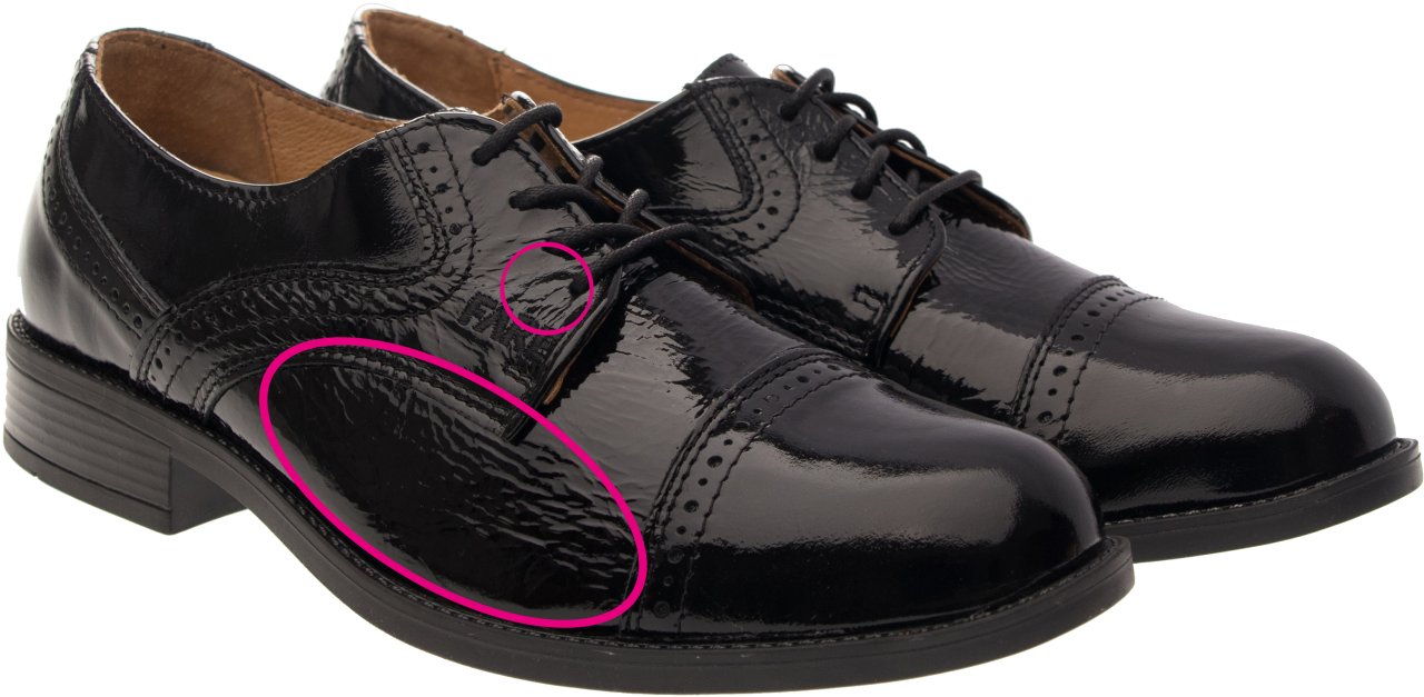 Celoroční, vycházková obuv, šněrovací. Vrchový materiál - pravá kůže hladká - černý lak. Podšívka - pravá kůže. Podešev je z termoplastického kaučuku. Obuv má pevný opatek i špici, předností je vyjímatelná vkládací stélka.